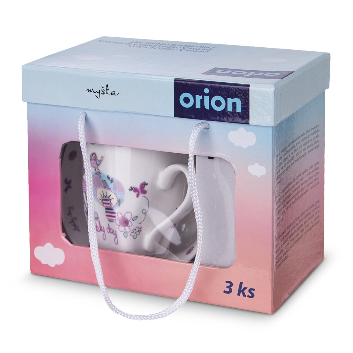 Kód produktu 112344Porcelánová jídelní sada MYŠKA tvořená hrnečkem o objemu 0,2 l, miskou o rozměrech 12×12×5,5 cm a talířem o rozměrech 17,5×15 cm.