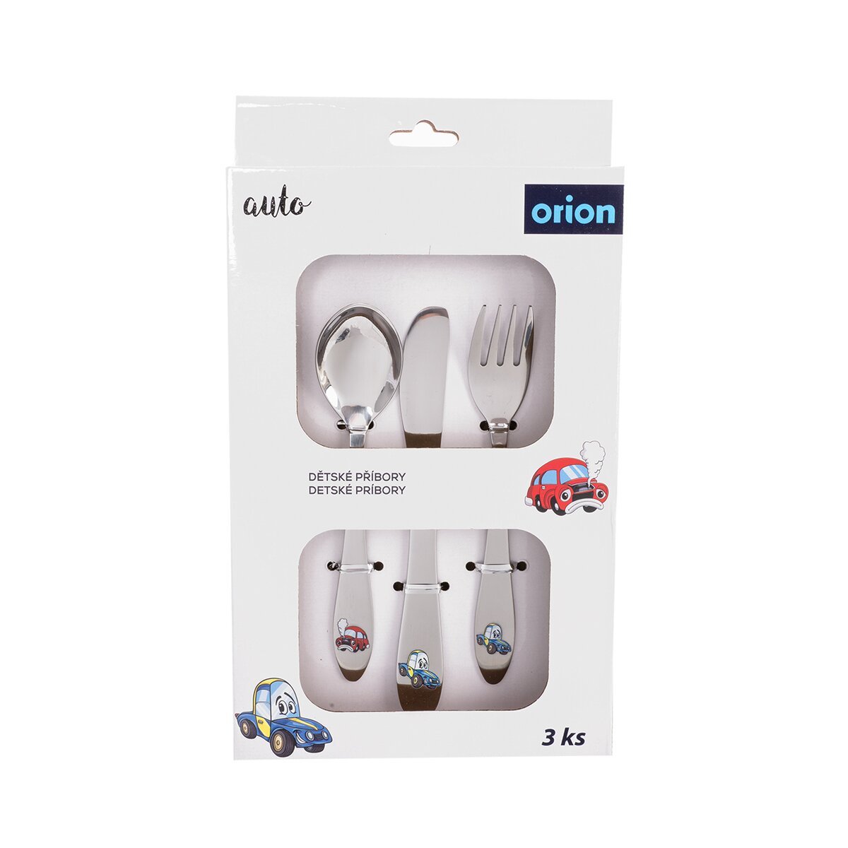 Set dětských nerezových příborů s barevným motivem autíček obsahuje lžíci, vidličku a nůž a je určen pro každodenní používání.