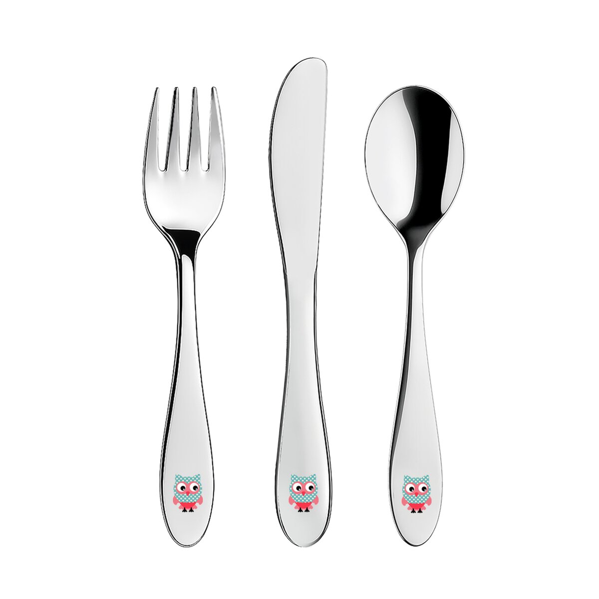 Kód produktu 143675Set dětských nerezových příborů s barevným motivem sovy obsahuje lžíci, vidličku a nůž a je určen pro každodenní používání.