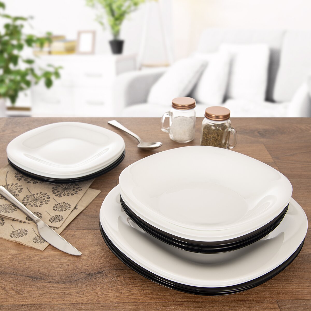 Kód produktu 129535Jídelní sada CARINE z tvrzeného skla je tvořena šesti dezertními, šesti hlubokými a šesti mělkými talíři hranatého tvaru a kombinuje bílou a černou barvu.