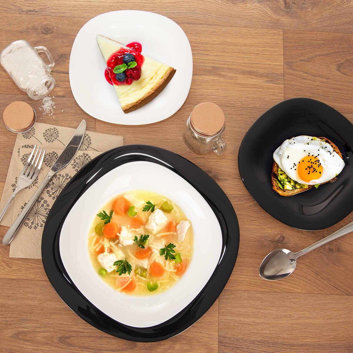 Obsahuje černé a bílé hluboké, mělké a dezertní talíře. Běžné stolování i efektní foodstyling tak vynikne, díky nadčasovému, mírně hranatému tvaru. Navíc je můžete při zakládání tabule různě kombinovat, na mělký bílý talíř položit černý dezertní apod.