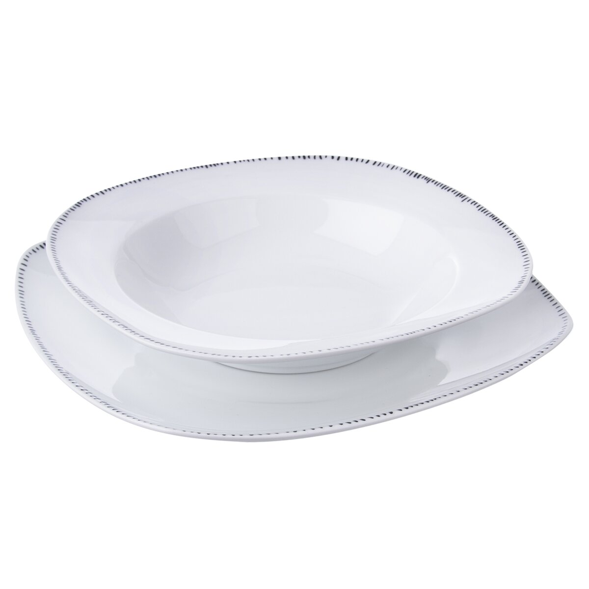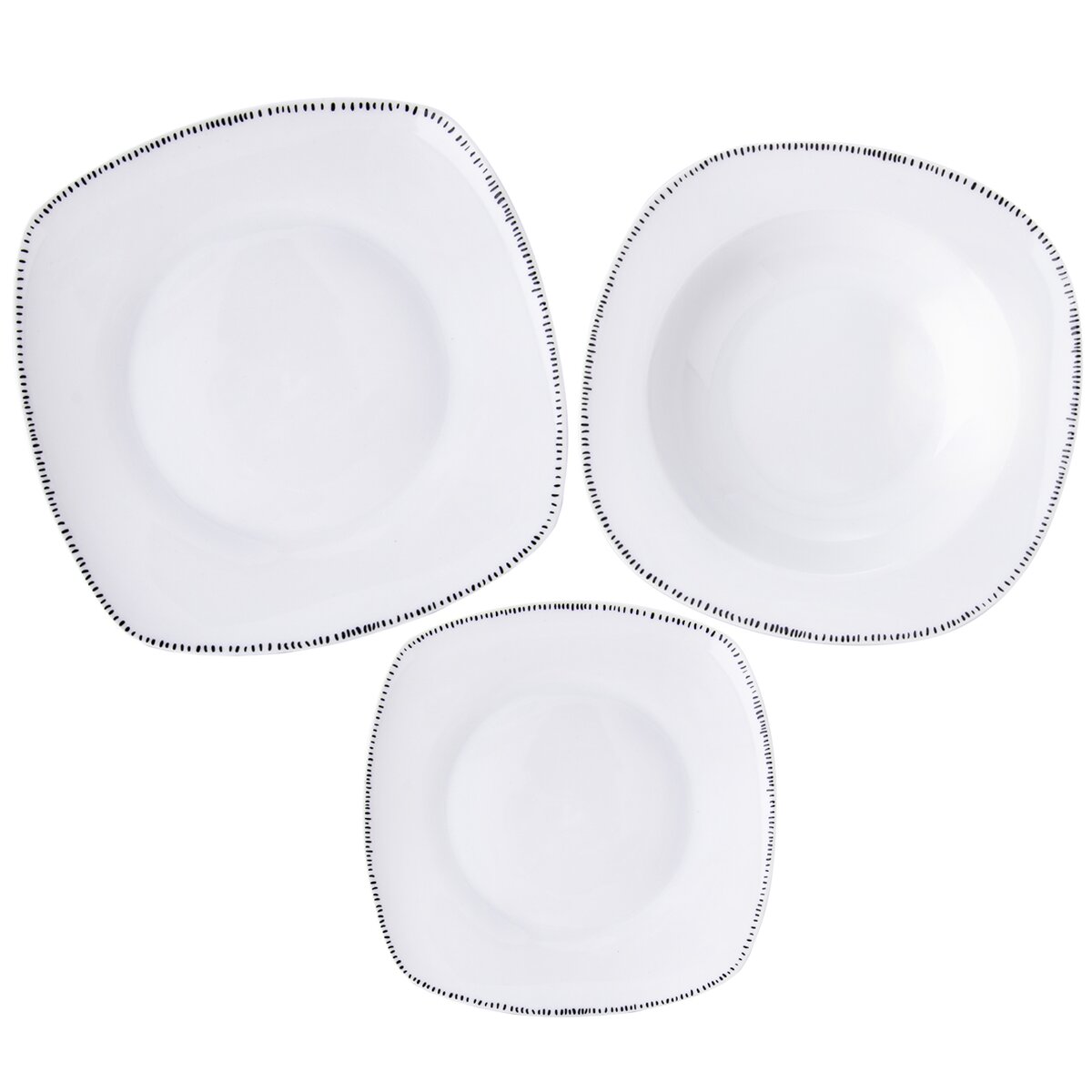 Kód produktu 128457Jídelní porcelánová sada je tvořená šesti hranatými dezertními, šesti hlubokými a šesti mělkými talíři s jemným dekorem čárek po obvodu.