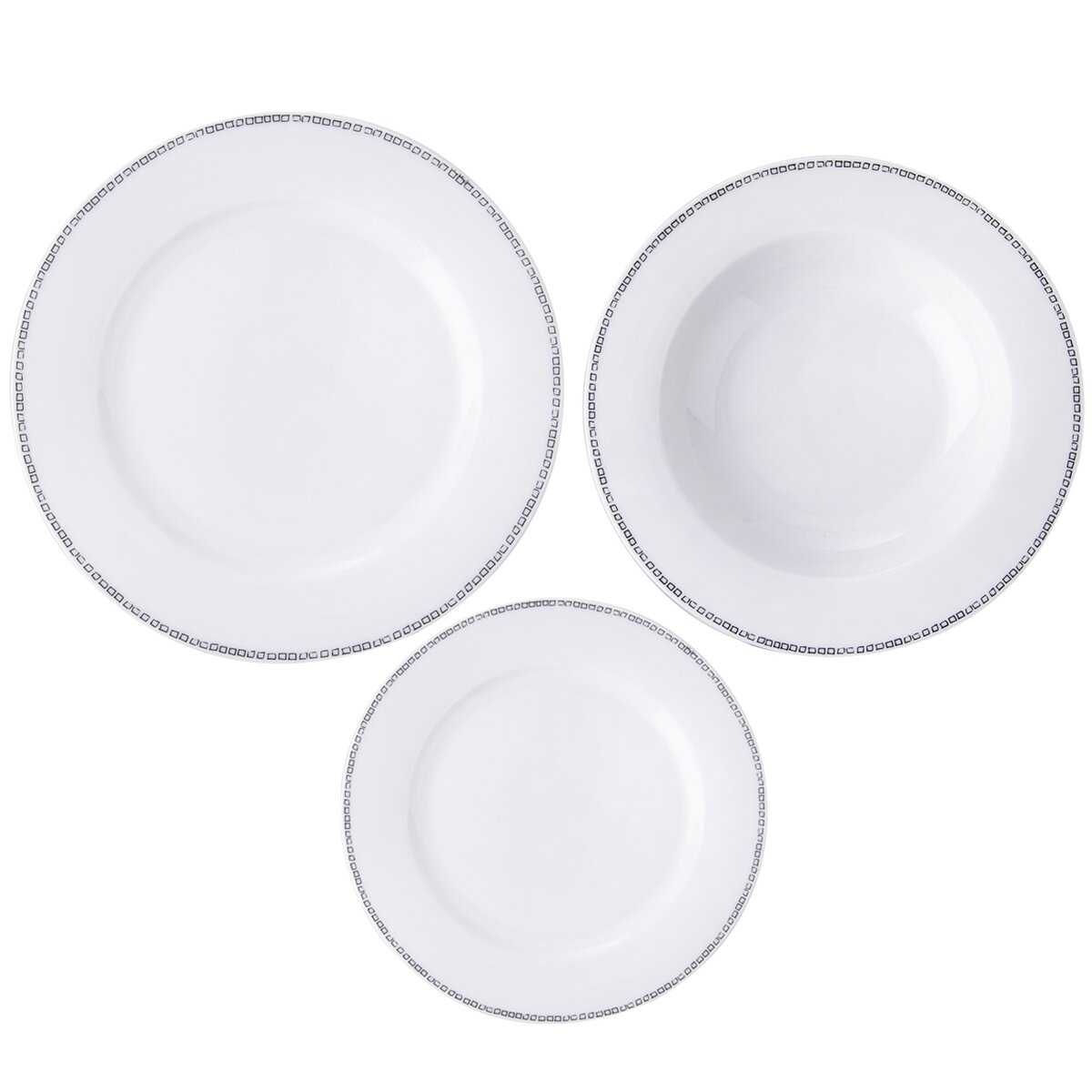 Kód produktu 128455Jídelní porcelánová sada je tvořená šesti dezertními, šesti hlubokými a šesti mělkými talíři s jemným dekorem čtverečků po obvodu.