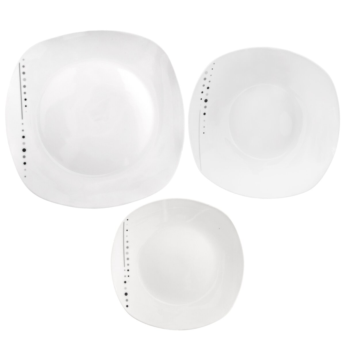 Kód produktu 112353Jídelní porcelánová sada se skládá z 6 hranatých dezertních, 6 mělkých a 6 hlubokých talířů s jemným geometrickým dekorem, minimalistickými šedo-černými body a čárami.