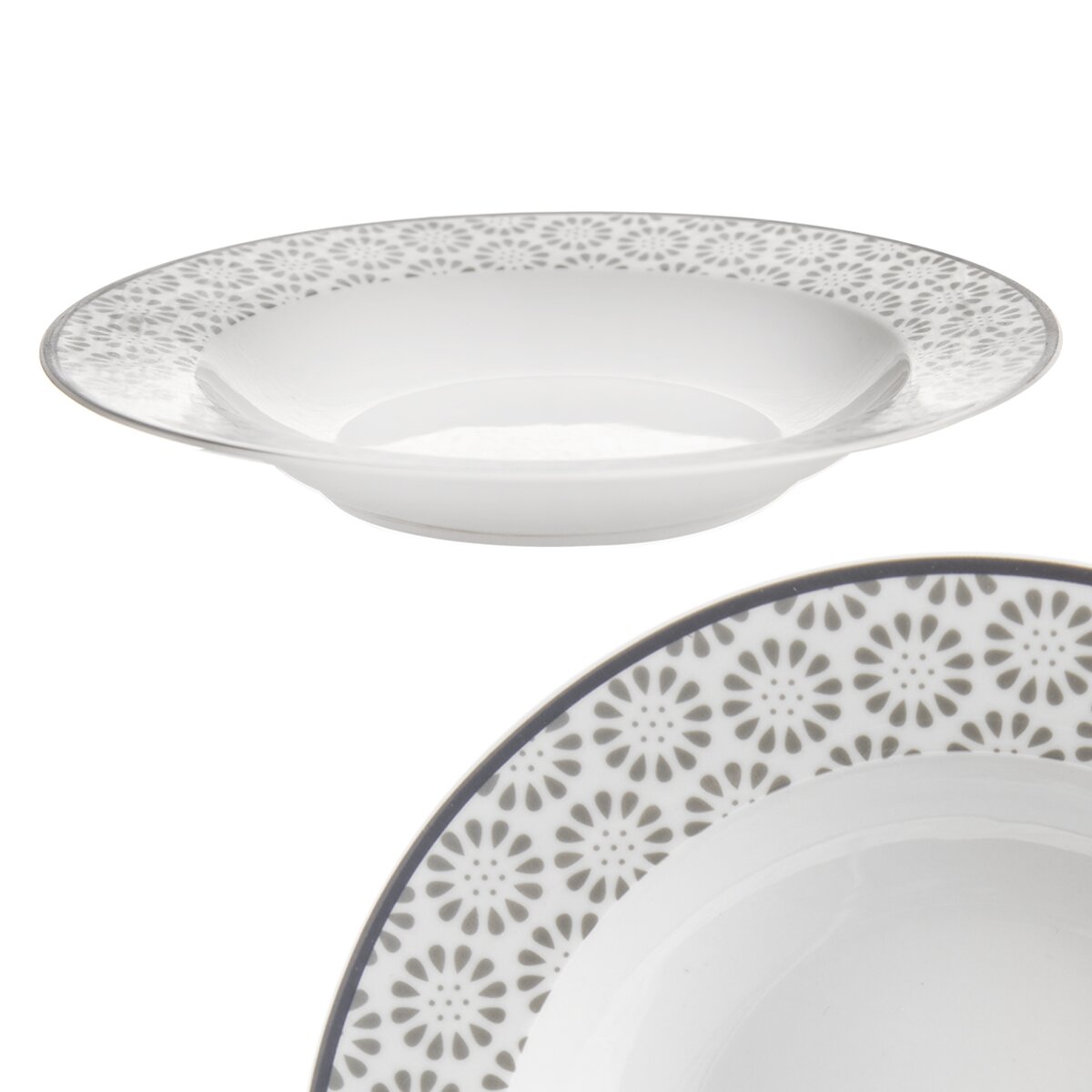 Kód produktu 112356Jídelní porcelánová sada se skládá z 6 kulatých dezertních, 6 mělkých a 6 hlubokých talířů s jemným dekorem, připomínajícím květy.