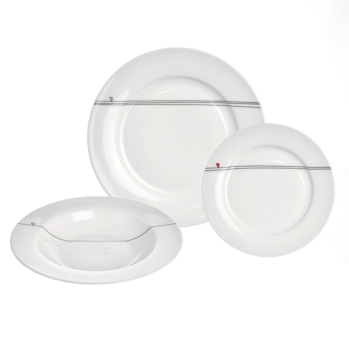 Kód produktu 128481Jídelní porcelánová sada SRDÍČKA je tvořena šesti dezertními, šesti hlubokými a šesti mělkými talíři s jemným dekorem linek a drobných srdíček.