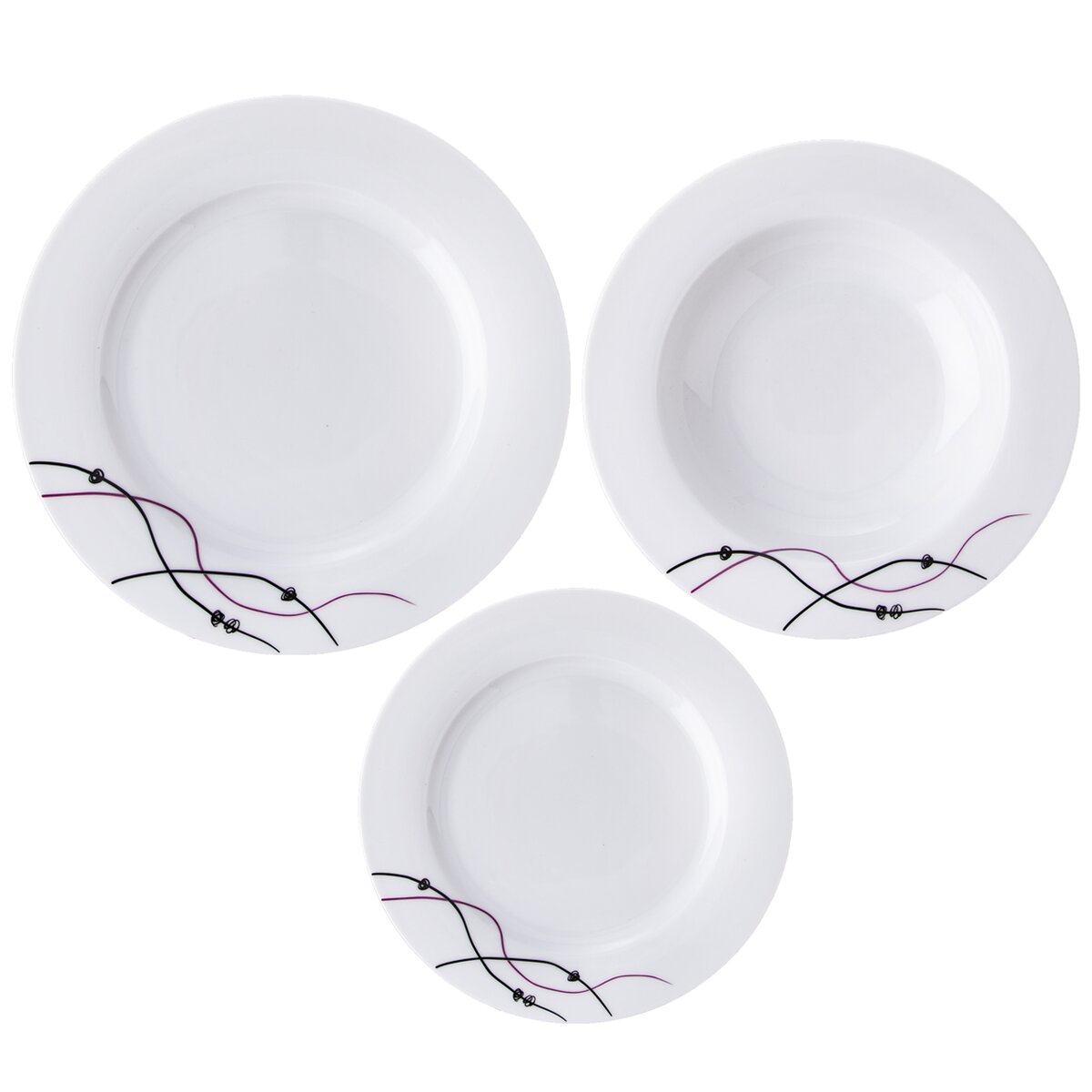 Kód produktu 128454Jídelní porcelánová sada je tvořená šesti dezertními, šesti hlubokými a šesti mělkými talíři s jemným dekorem vlnek.