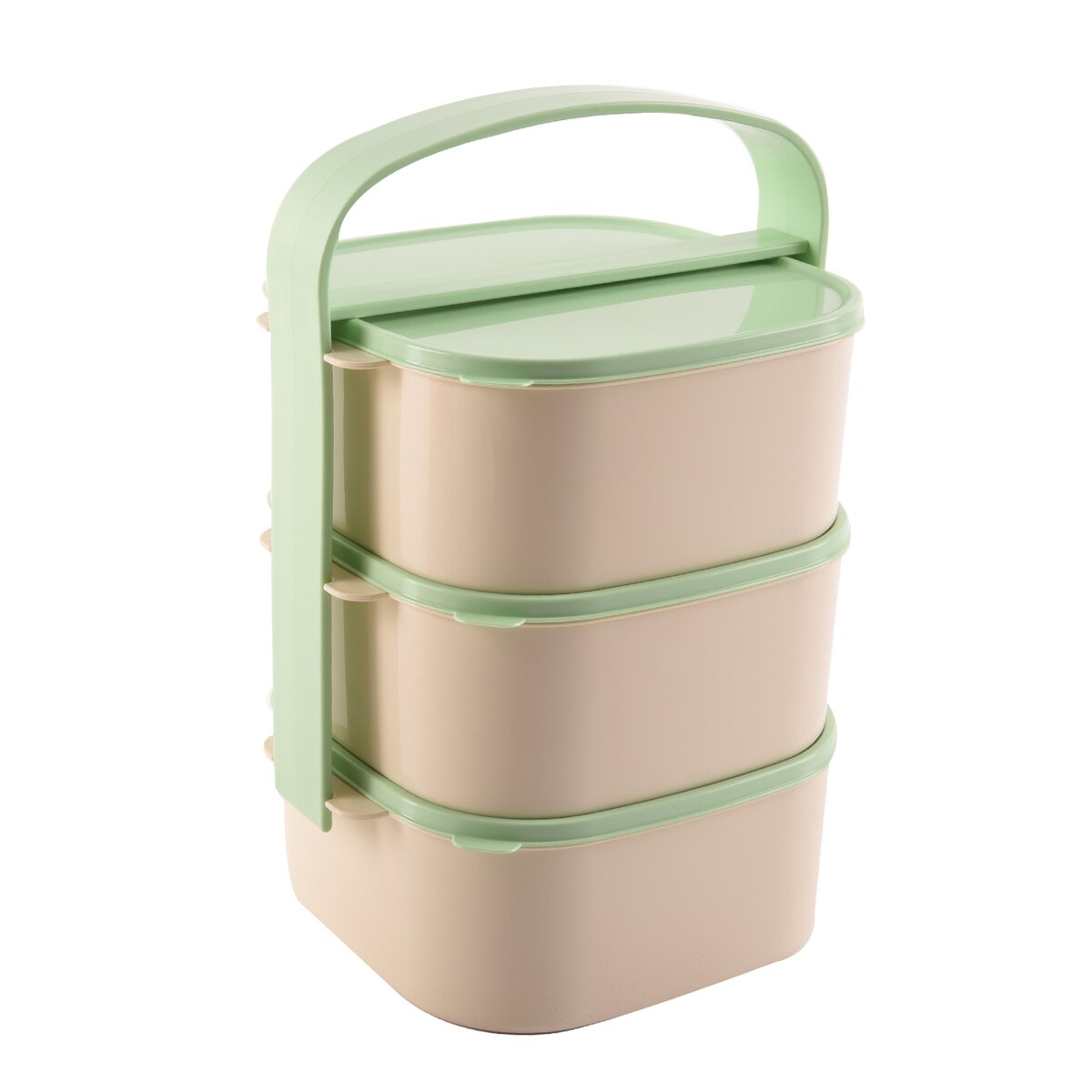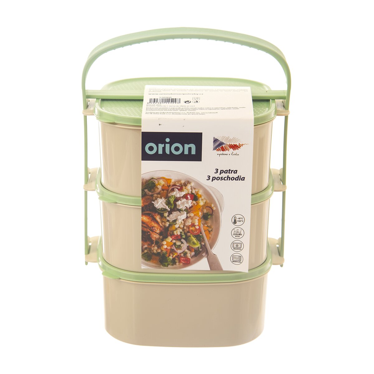 Kód produktu 120960Zeleno-béžový třípatrový jídlonosič ALMI o objemu 3×1,15 l. Obsahuje 3 hranaté misky z kvalitního plastu, z nichž je každá opatřena vlastním víčkem.