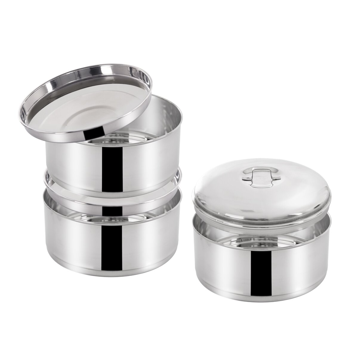 Kód produktu 120964Nerezový třípatrový jídlonosič v rovném provedení, jehož součástí jsou 3 misky o objemu 1,3 l, samostatná víčka misek, vrchní poklice a kovový stojan s přezkou a uchem, který sestavu spojí a umožní jeho přenášení.