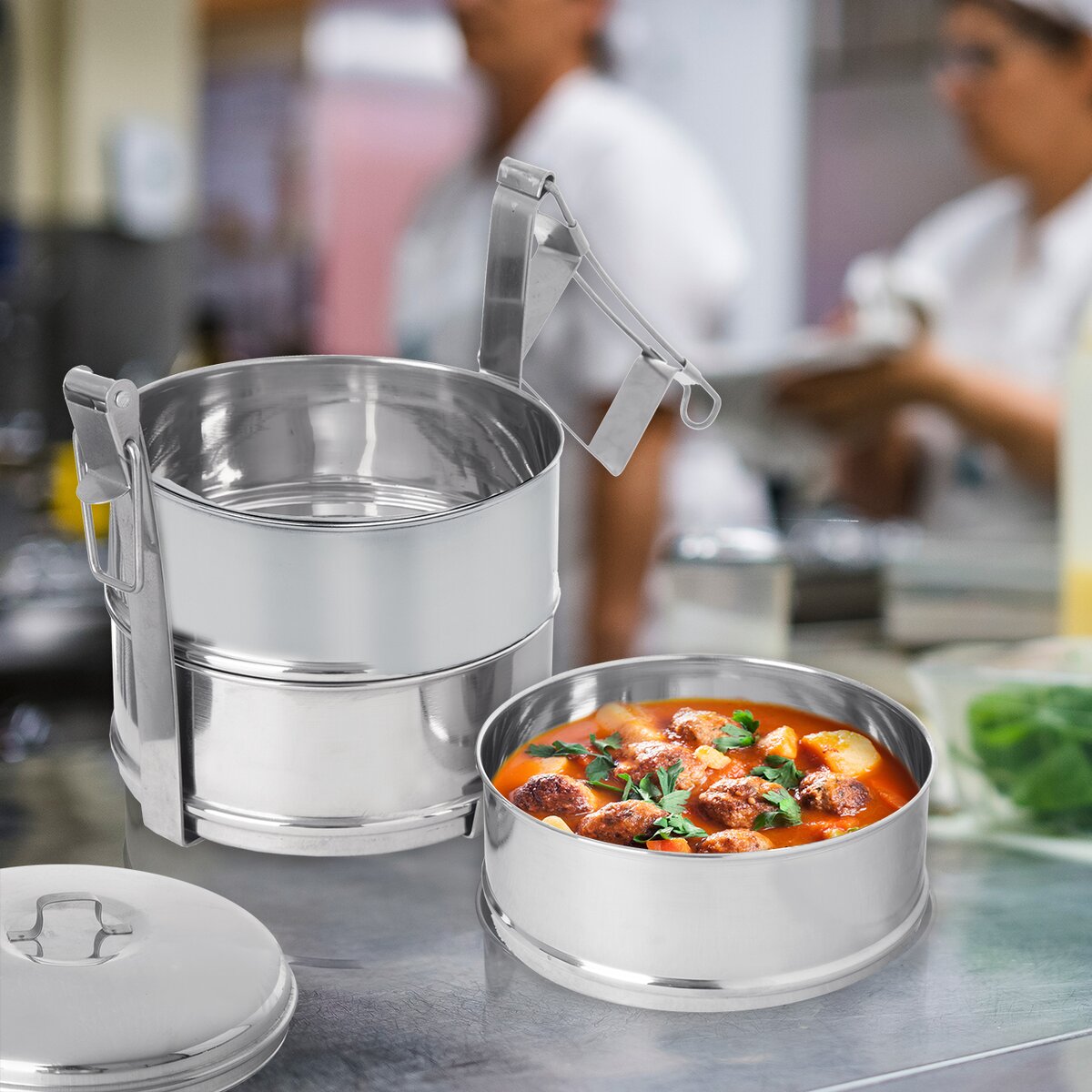 Kód produktu 120902Nerezový třípatrový jídlonosič v rovném provedení, jehož součástí jsou 3 misky o objemu 1 l, vrchní poklice a kovový stojan s přezkou a uchem, který sestavu spojí a umožní jeho přenášení.