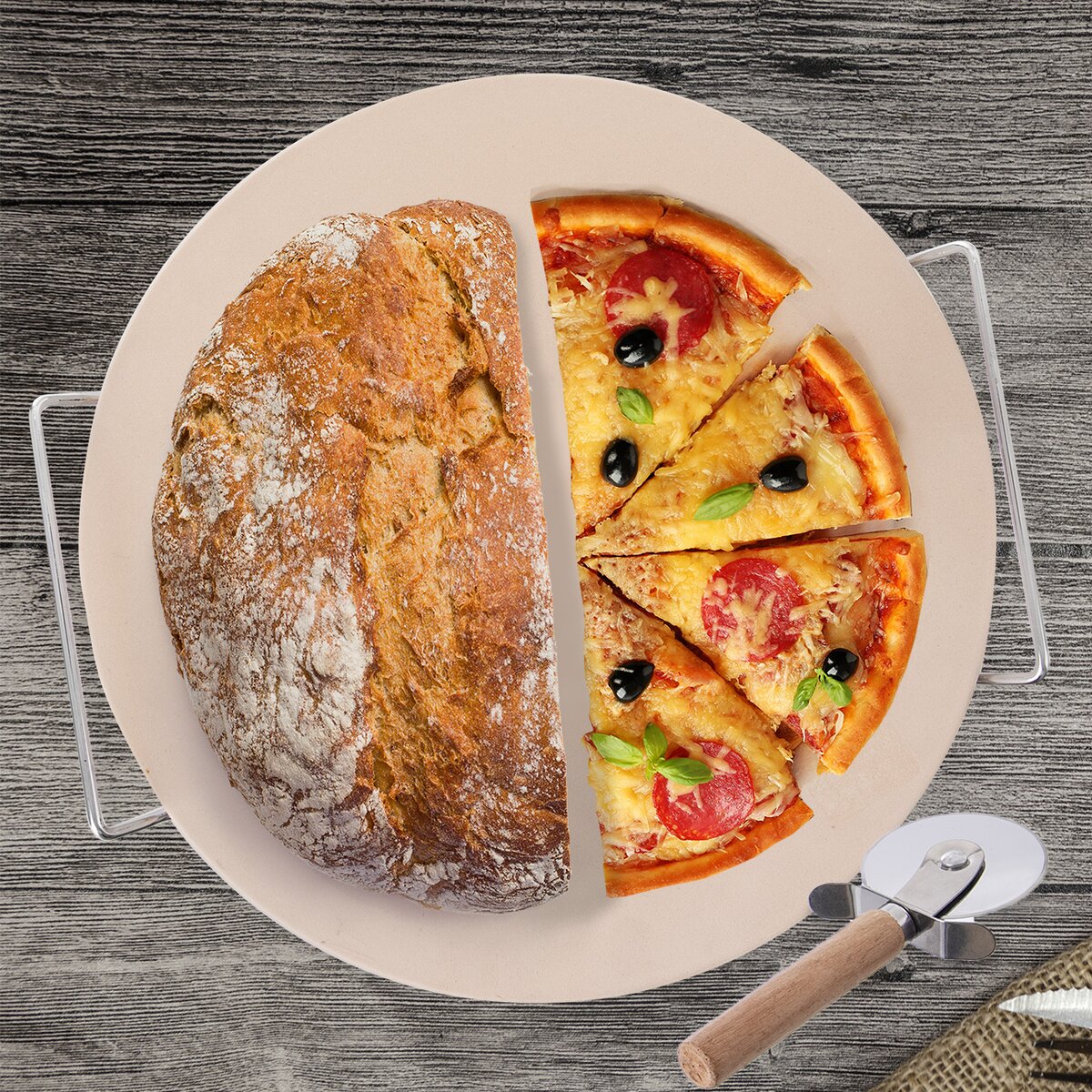 Kód produktu 123778Kulatá kameninová deska průměru 33 cm cm, ideální na pečení křupavé pizzy, chleba, masa, ryb i zeleniny ve všech typech trub. Součástí je drátěný stojan a kovový kráječ na pizzu s dřevěnou rukojetí.
