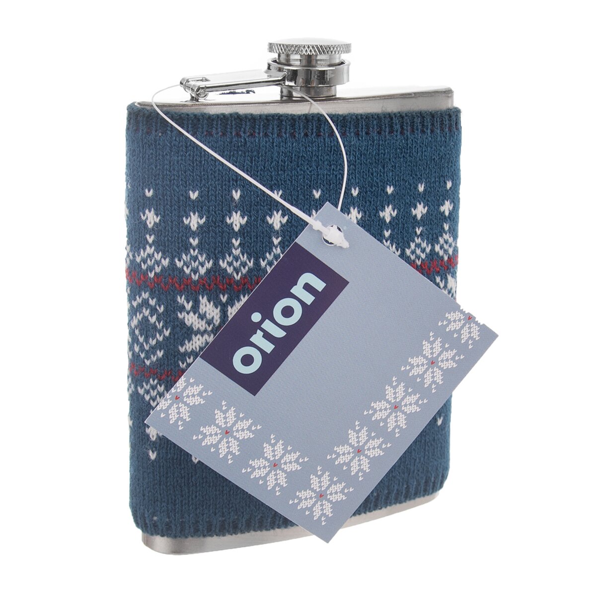 Kód produktu 127705Kapesní lahvička na alkohol – placatka doplněná o pletený svetr se vzorem. Materiál: nerez, akryl. Rozměry: objem 0,24 l, 9,5x2,5x13,5 cm, svetr 10x11 cm.