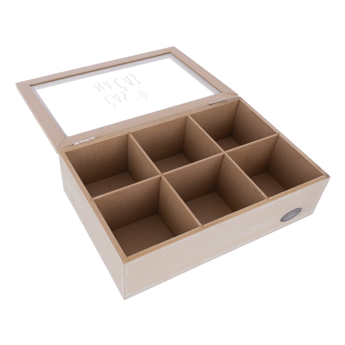 Vašim hostům, kolegům v práci nebo klientům tak můžete stylově nabídnout čaj, který mají rádi. Přírodně zbarvená kazeta s jemnou bílou patinou z MDF desek má velikost 24x16x7 cm a víko opatřené skleněným průhledem s nápisem ČAS NA ČAJ. Ten vznikl v dílně našich Orion designérů. Pohodlné otevírání a zavírání zajistí kovové panty.