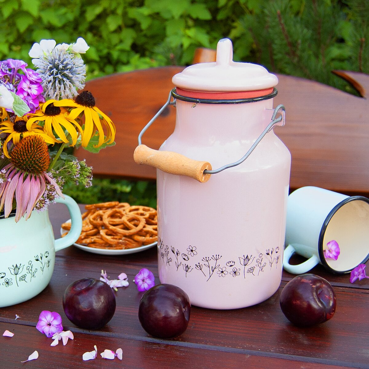 Pokud si chodíte kupovat čerstvé mléko, pořiďte si konvičku, díky které váš nákup donesete domů pohodlně a bez zbytečných ztrát. Tato smaltovaná konvice o objemu 2 l vynikne díky své pastelově růžové barvě a jemnému dekoru rozkvetlé louky. Navíc má ladící pokličku a praktické dřevěné ucho.