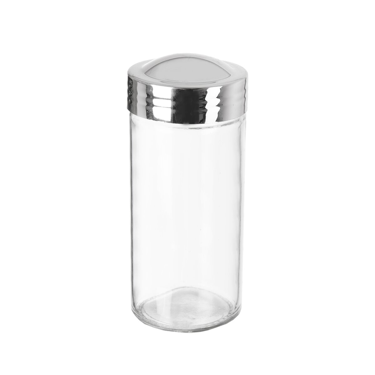 Kód produktu 153611Skleněná kořenka objemu 80 ml s pochromovaným víčkem a sypátkem k uložení koření, bylinek, dochucovadel.