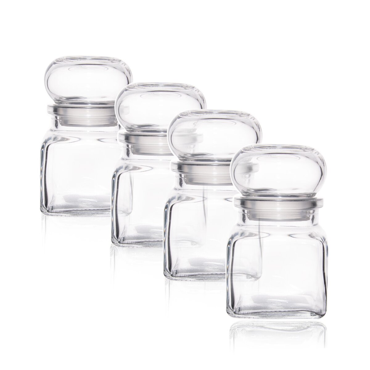 Kód produktu 153557Sada 4 hranatých skleněných kořenek s víčkem objemu 120 ml na uložení koření, bylinek, dochucovadel.