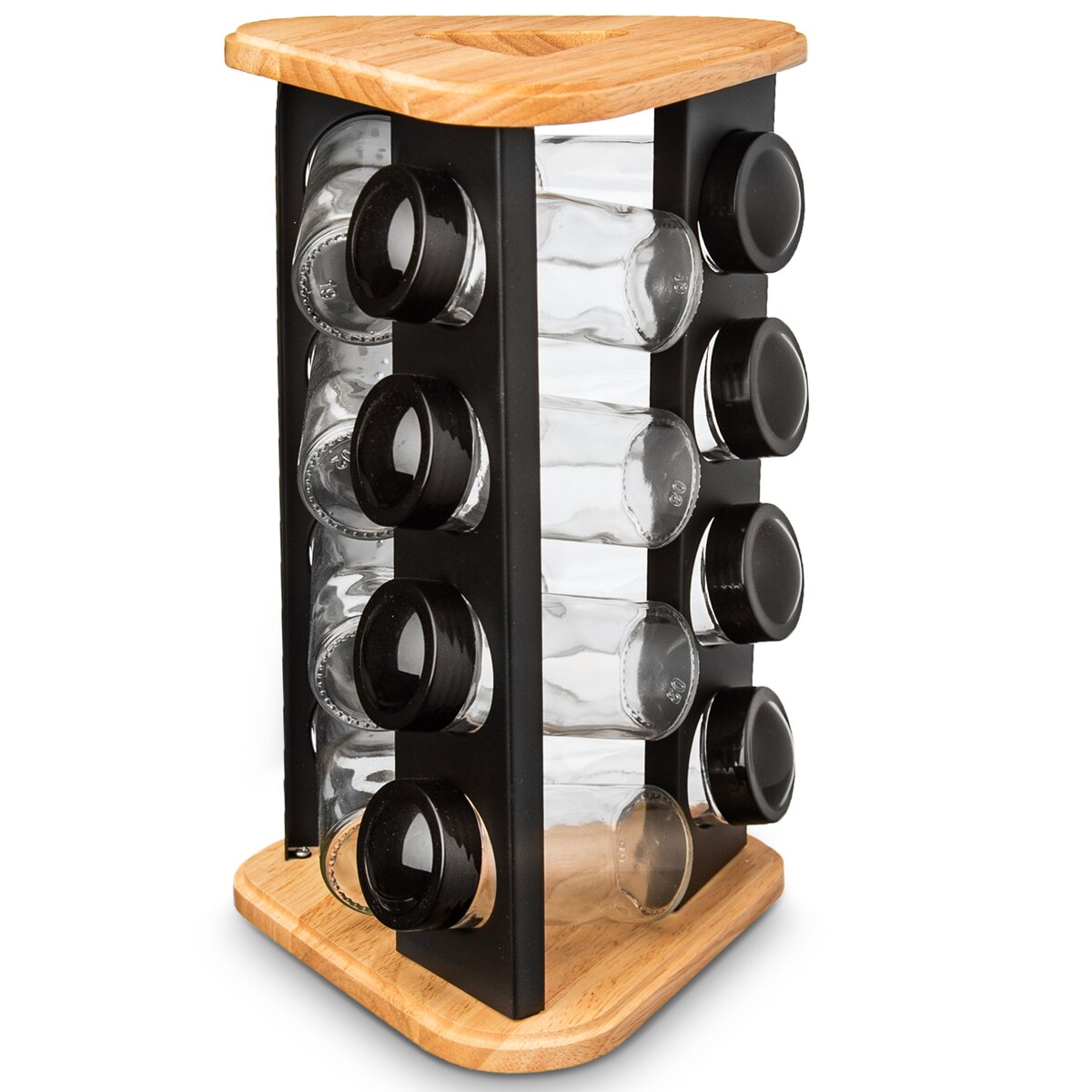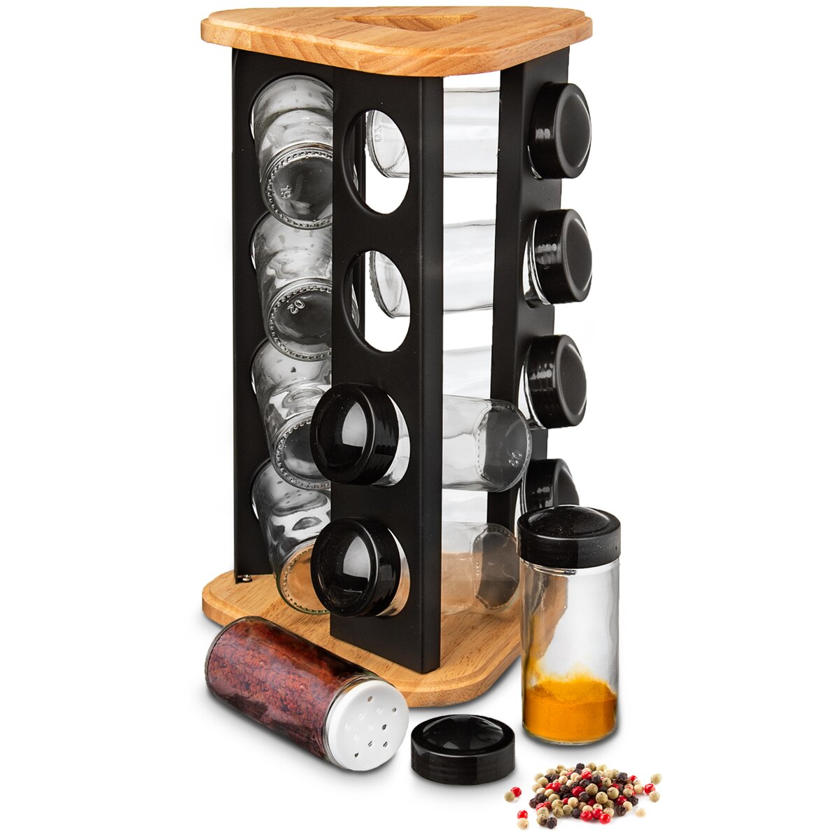 Více informacíDesignový otočný dřevěný stojan na trojúhelníkové základně rozměru 18x18x18 cm s černými nerezovými lištami s otvory, jehož součástí je 12 kusů skleněných kořenek průměru 4,5 cm a výšky 10 cm. Každá má plastové sypátko a černé víčko z PE. Podle vloženého koření nebo dochucovadla tak můžete sypátko ponechat nebo jej odděláte a pohodlně nasypete a vysypete větší kousky, např. nové koření, hřebíček.