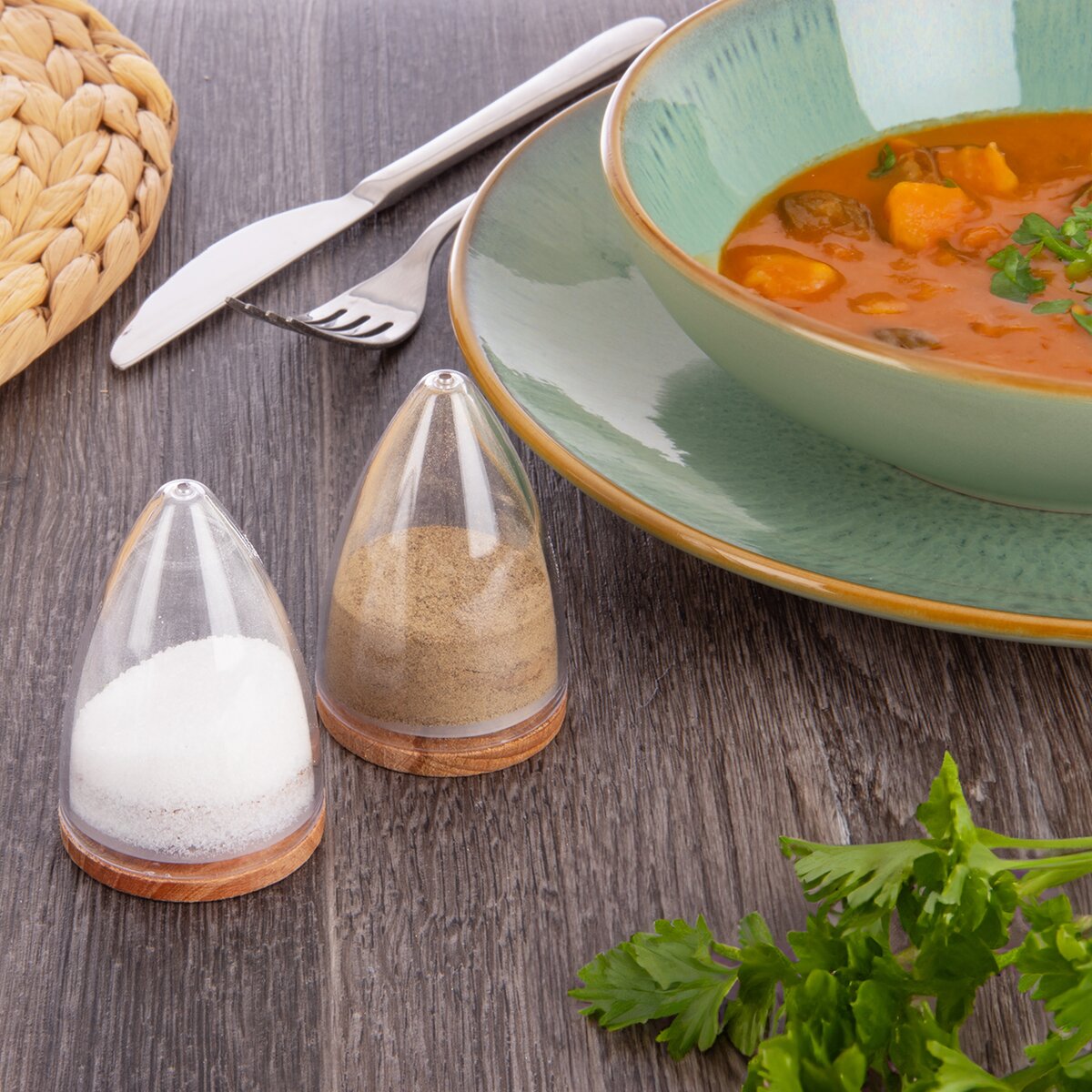 Více informacíPraktická dvojice průhledných kořenek z PS plastu zajistí, že budete mít pepř a sůl na stole vždy po ruce. Jsou umístěny na základně z bukového dřeva, které jsou doplněny silikonovým těsněním, čímž se uchová vložené koření v suchu a nedojde k jeho vysypání širší stranou. Koření či sůl jednoduše nasypete do připravovaného pokrmu nebo dochutíte naservírované pokrmy přímo na stole díky malému otvoru ve špičce těchto kónických kořenek.