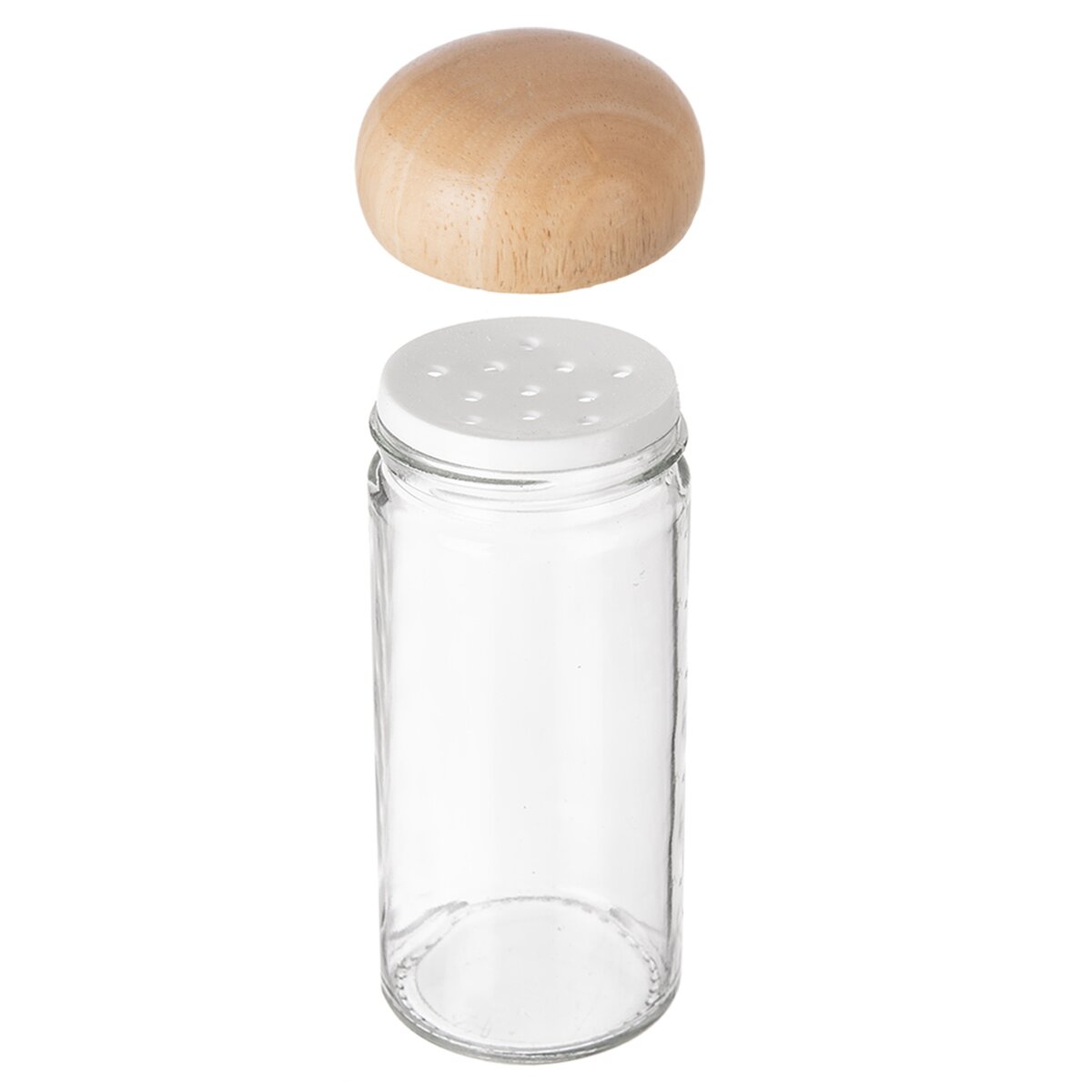 Skleněné kořenky s oblým dřevěným uzávěrem uchovají vůni koření, bylinek a různých dochucovadel a udrží je v suchu. Průhledné tělo usnadní identifikaci dochucovadla, případně je můžete polepit popsanou samolepkou.