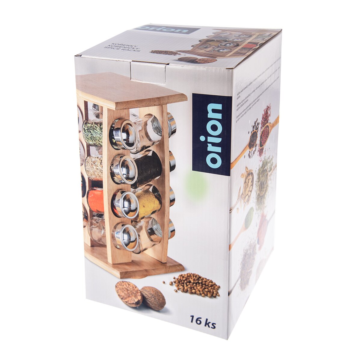 Kód produktu 123919Dřevěný otočný stojan se 16 skleněnými kořenkami pro uložení koření, bylinek a dochucovadel.