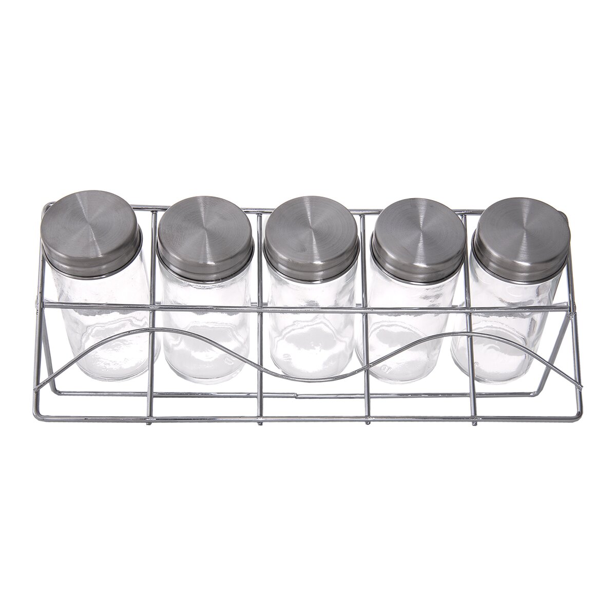 Kód produktu 153662Kovový stojan s 5 skleněnými kořenkami s nerezovým víčkem pro uložení koření, bylinek a dochucovadel.