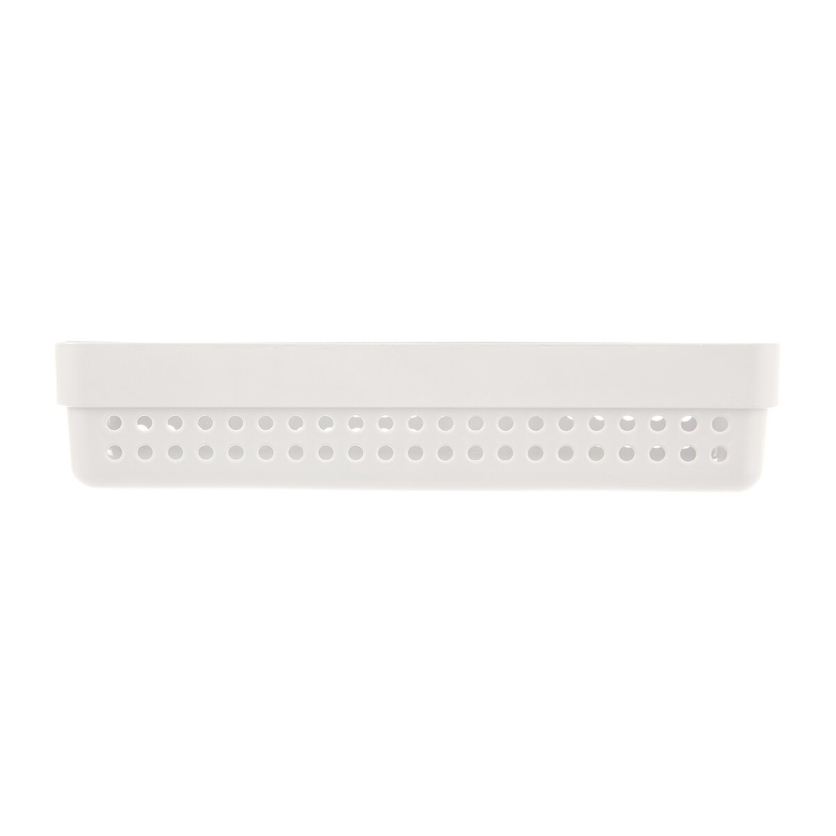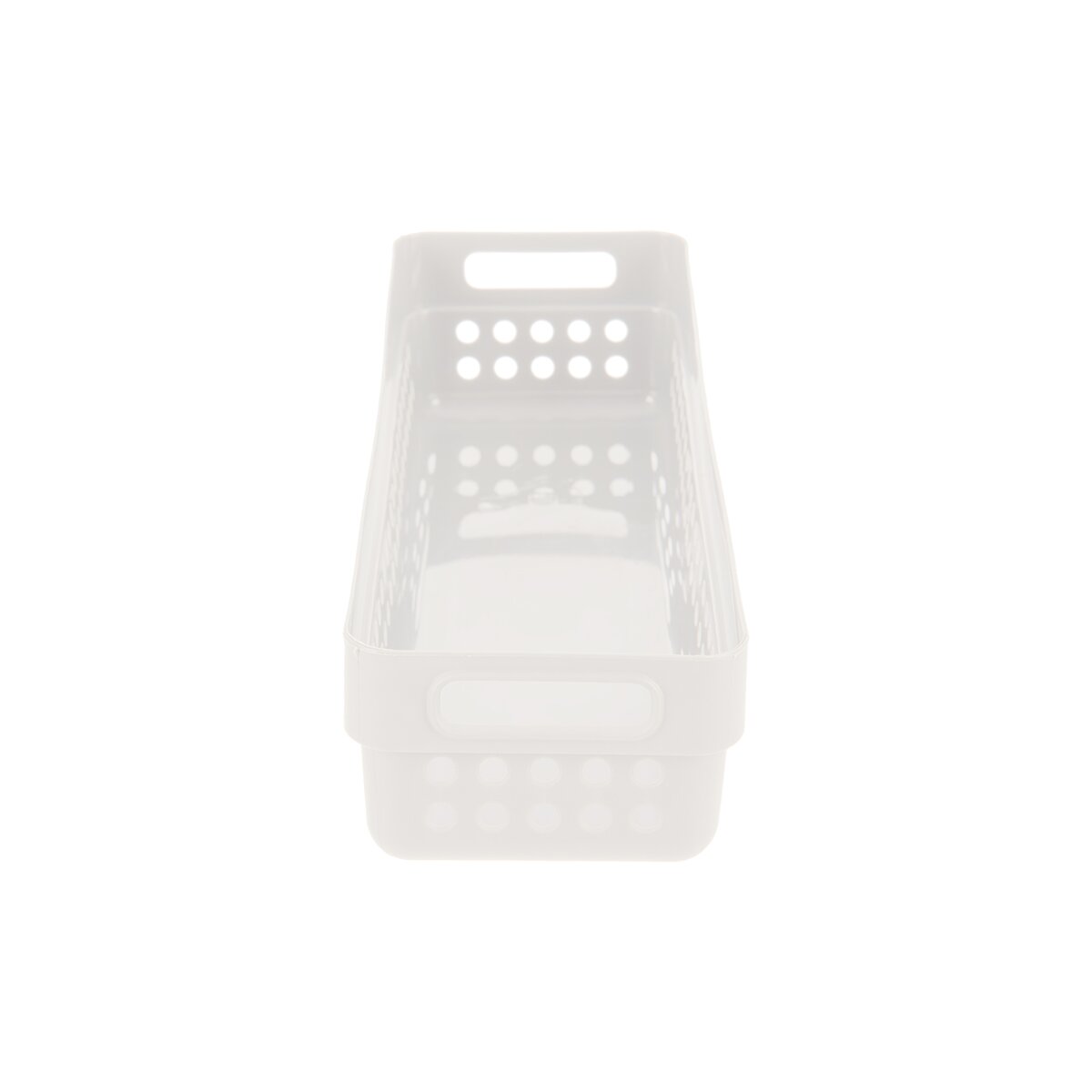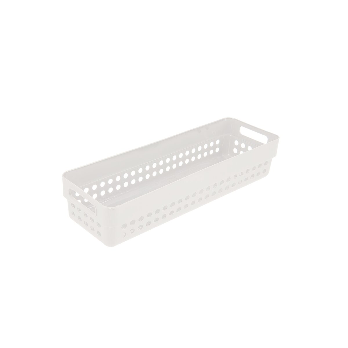 Kód produktu 731638Plastový podlouhlý košík v bílé barvě má velikost 23,5x7,5x5 cm a hodí se k uložení kořenek, příborů, psacích potřeb i drobné kosmetiky.