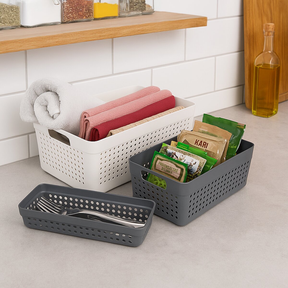 Více informacíPraktické košíky různých velikostí se hodí v domácnosti všude. Na pracovní desce, v zásuvce, šatně, v potravinové skříni i v kanceláři pomohou s organizací a pořádkem.