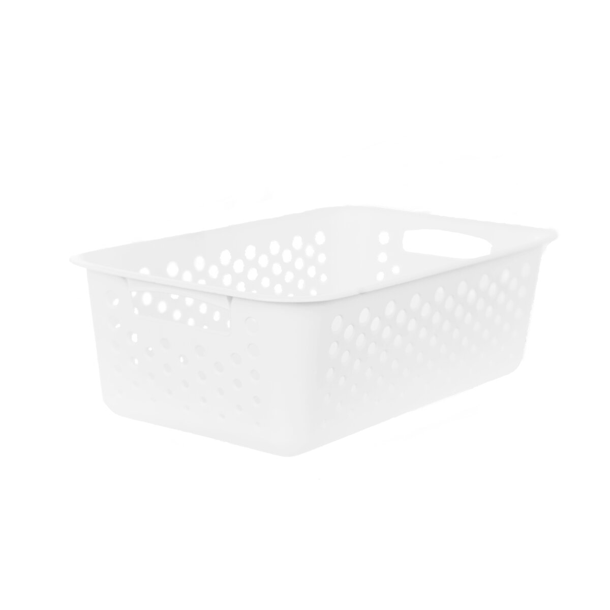 Kód produktu 731609Bílý plastový košík o rozměrech 25x16x8 cm slouží k uložení drobných předmětů v domácnosti.