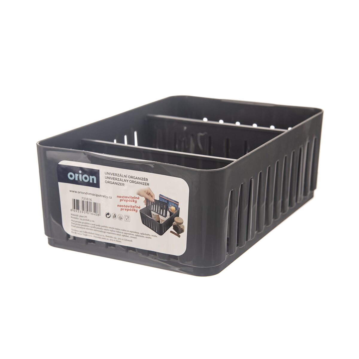 Kód produktu 731616Šedý košík velikosti 24,5x16x8,3 cm s nastavitelnými přepážkami je určen k ukládání drobností v kuchyni, koupelně, pokoji i dílně. Dvě přepážky lze snadno vyjmout a přizpůsobit členění košíku podle potřeby.