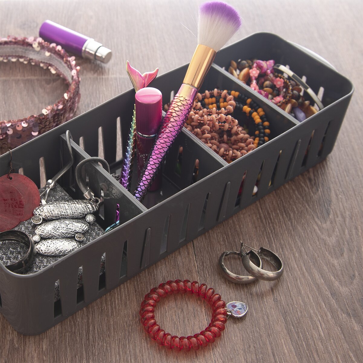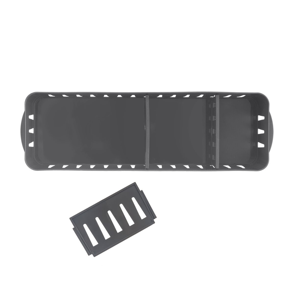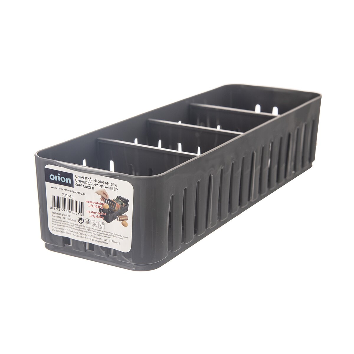 Kód produktu 731615Šedý košík velikosti 32x10x6,8 cm s nastavitelnými přepážkami je určen k ukládání drobností v kuchyni, koupelně, pokoji i dílně. Tři přepážky lze snadno vyjmout a přizpůsobit členění košíku podle potřeby.