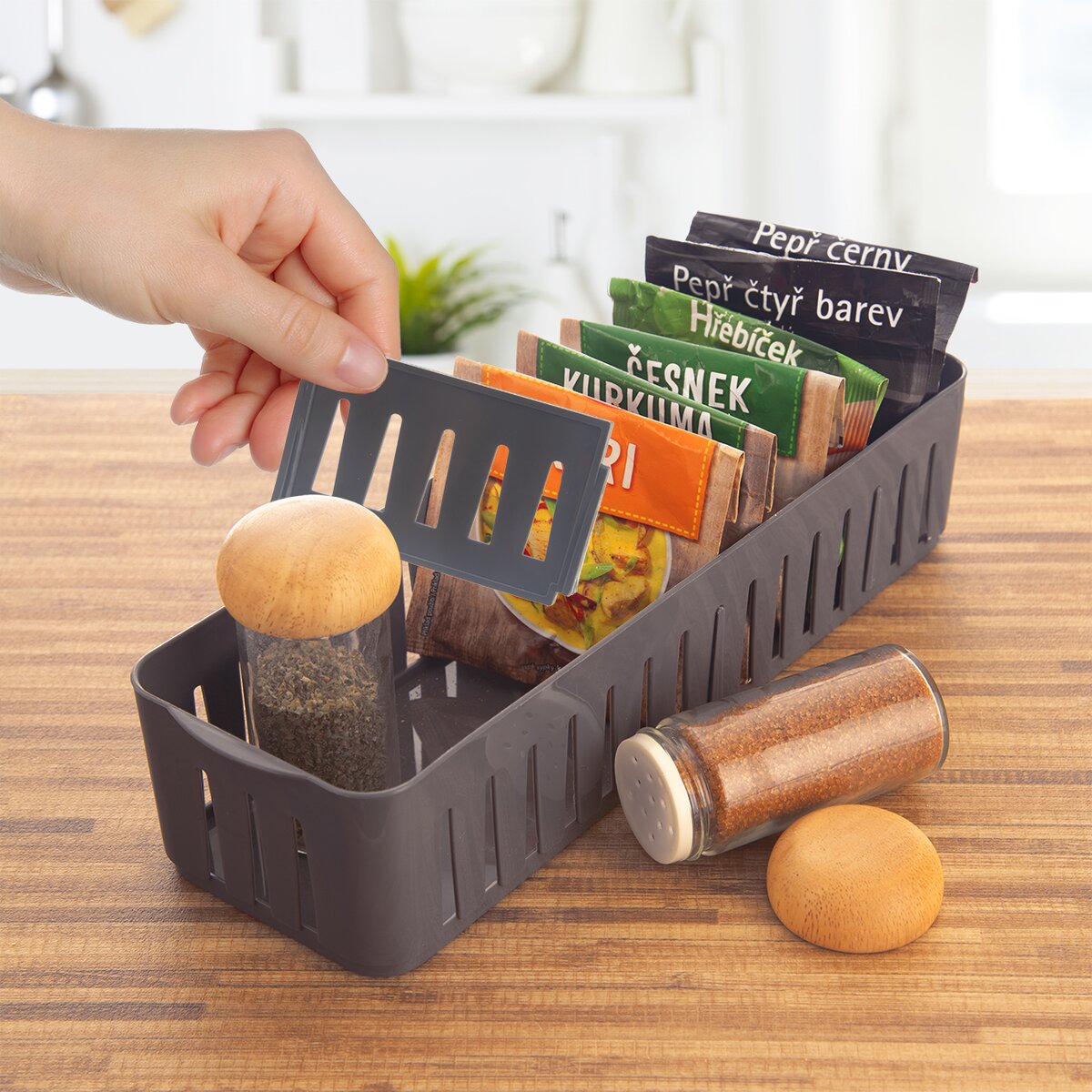 Boj s organizací různých drobností v domácnosti může být vyřešen s pomocí košíku FLEXI. Ať už to jsou sáčky s kořením v kuchyni, ve spíži nebo zásuvce, drobné šperky na toaletce nebo kosmetika v koupelně. Díky podélným otvorům po stranách lze nastavit vyjímatelné přepážky tak, aby bylo ukládání co nejefektivnější.