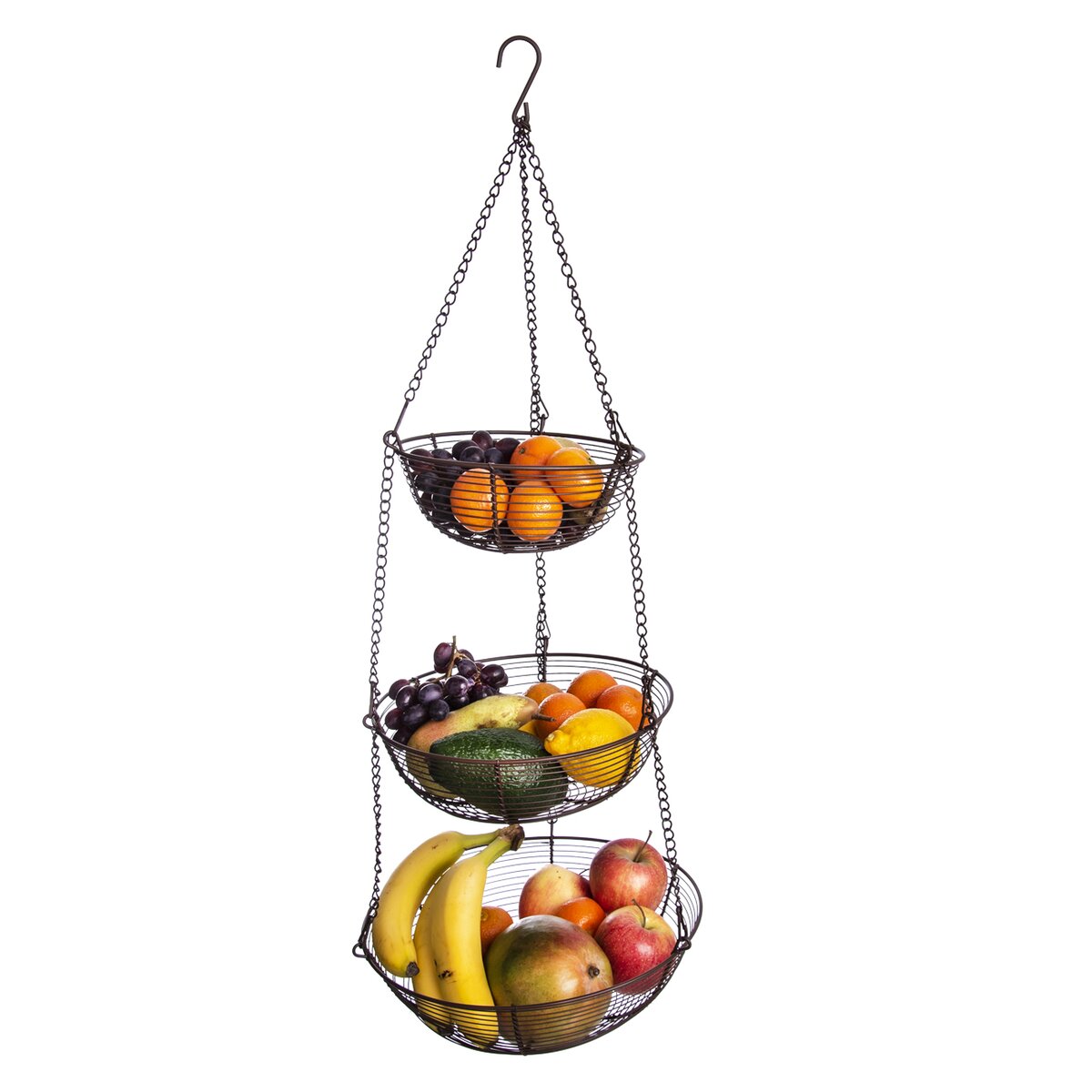 Kód produktu 540579Třípatrový závěsný košík na ovoce bude vypadat skvěle v moderní i klasické kuchyni. Materiál: drát s povrchovou úpravou. Nosnost 3 kg. Rozměry: pr. 20, 25 a 30 cm, v. 83 cm.