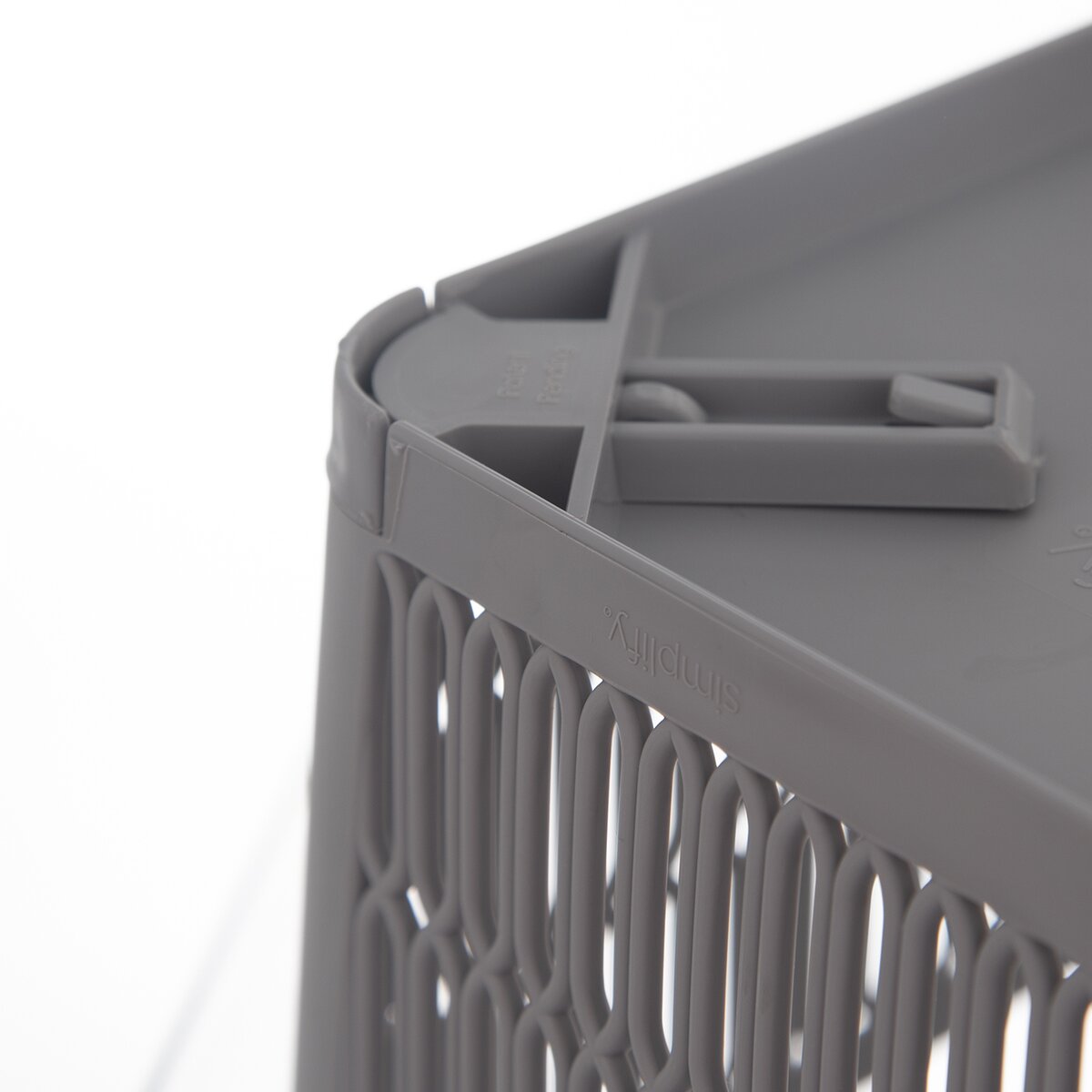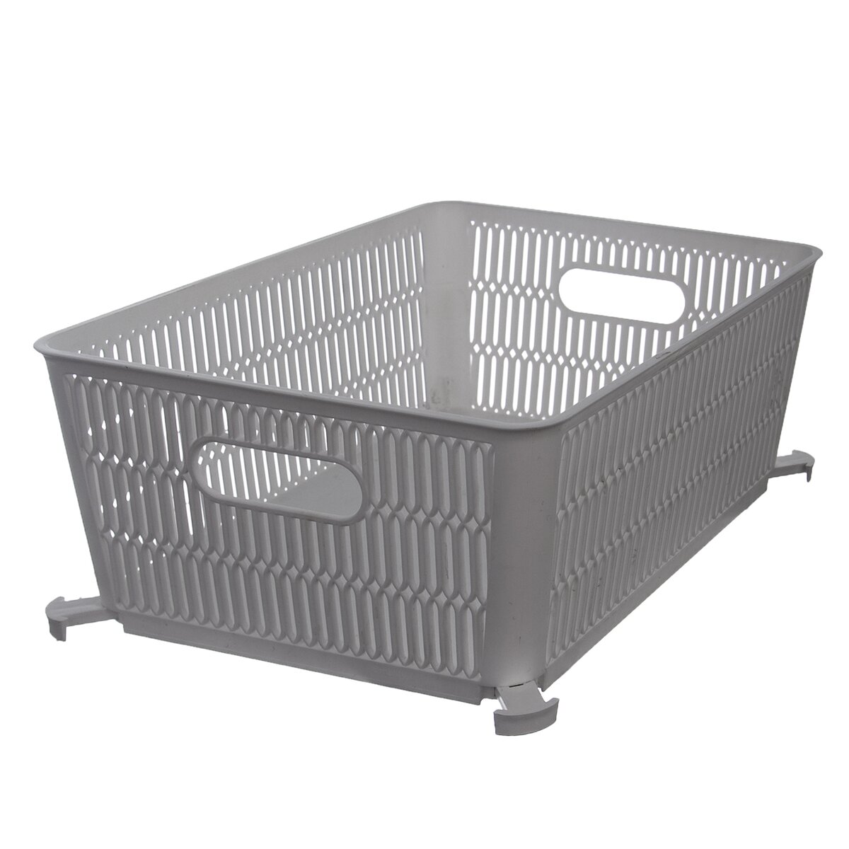 Šedý nižší košík NESTA má navíc vychytávku v podobě vysunovacích klapek v dolní části, z rohů lze klapky vysunout a uložit tak několik košíků na sebe.