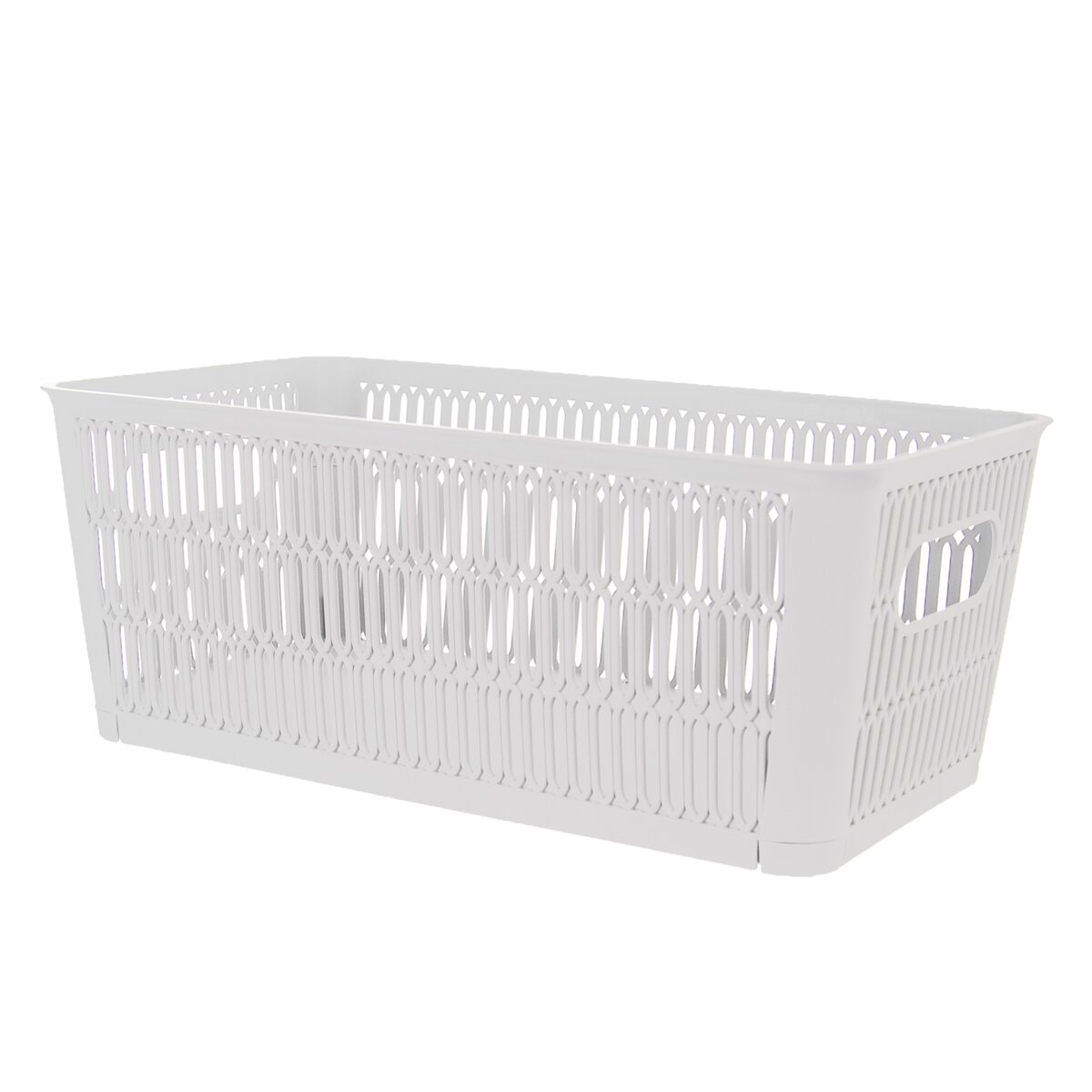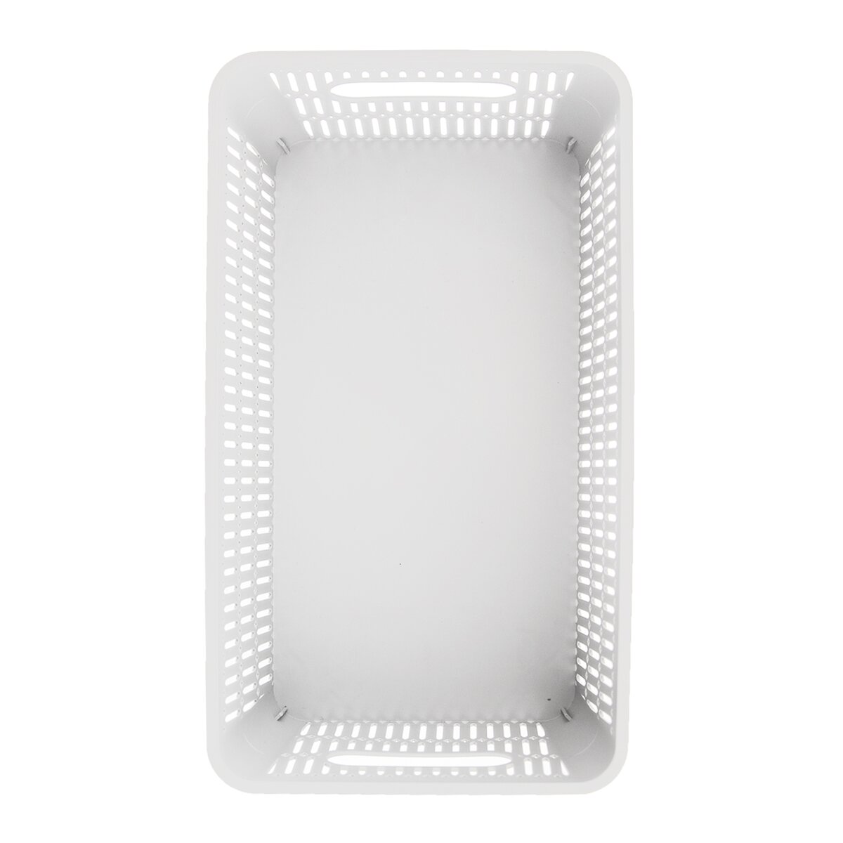 Bílý košík NESTA má navíc vychytávku v podobě vysunovacích klapek v dolní části, z rohů lze klapky vysunout a uložit tak několik košíků na sebe. Je vyroben z kvalitního plastu PP.