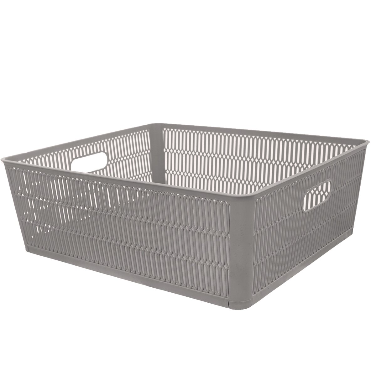 Větší šedý košík NESTA má navíc vychytávku v podobě vysunovacích klapek v dolní části, z rohů lze klapky vysunout a uložit tak několik košíků na sebe. Je vyroben z kvalitního plastu PP.