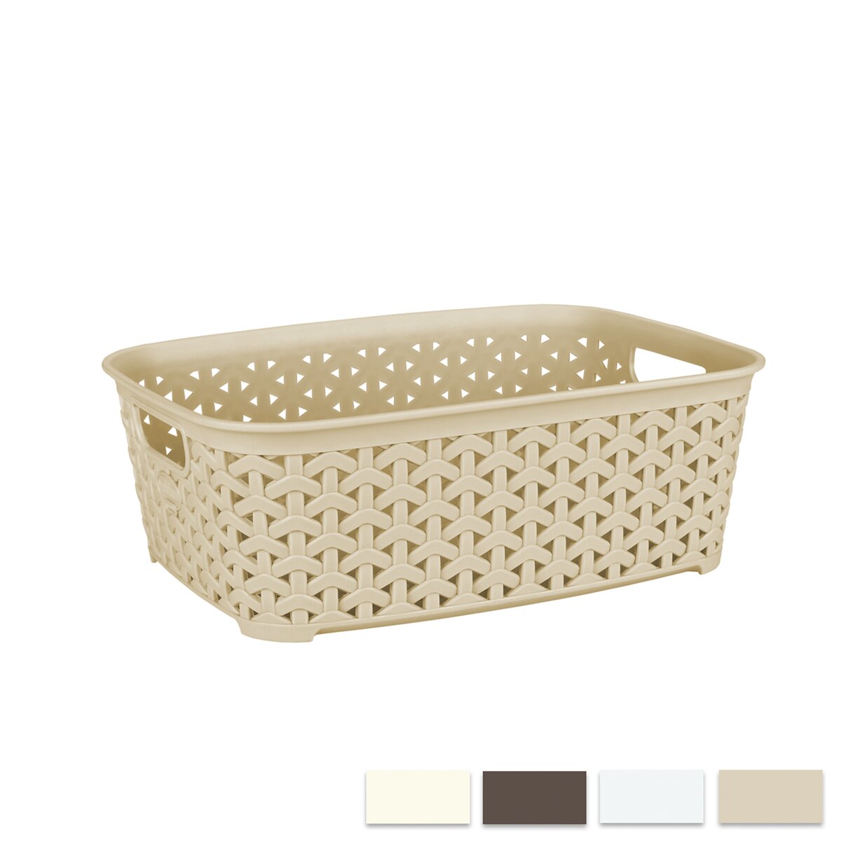 Kód produktu 730265Barevný plastový košík RATAN hranatého tvaru a se dvěma uchy. Jeho rozměry jsou 26×19×9 cm.