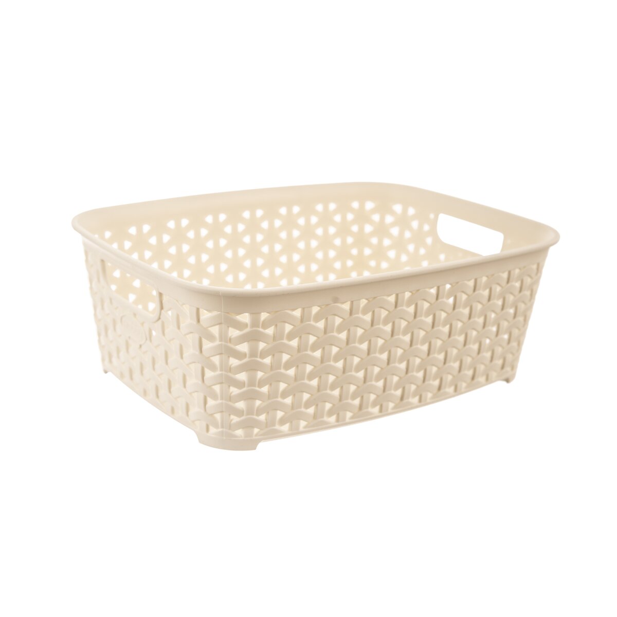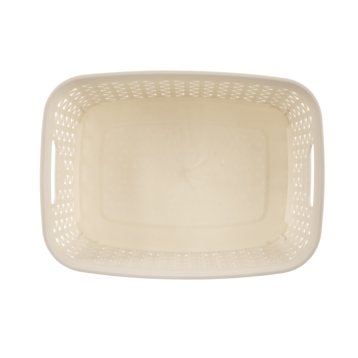 Kód produktu 731601Béžový plastový košík RATAN hranatého tvaru se dvěma uchy. Jeho rozměry jsou 26×19×9 cm.