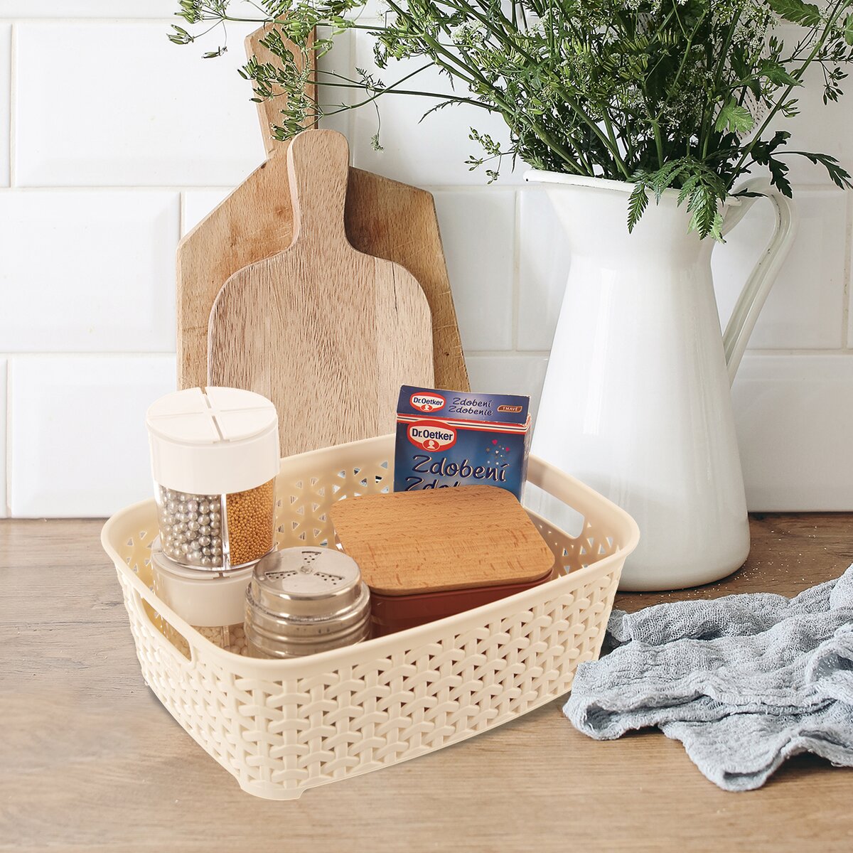 Zajímavý košík z PP plastu v dekoru RATAN o velikosti 26×19×9 cm. V kuchyni ho využijete k uložení drobností, kuchyňských dochucovadel, cukrářských potřeb, v šatně pro organizaci pásků, šátků nebo spodního prádla. Pomůže s úklidem drobných kancelářských potřeb v pracovně nebo studentském pokoji.