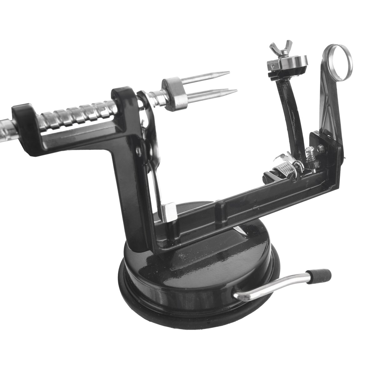 Kód produktu 125705Kovový mechanický kráječ jablek je určen k loupání slupky, odstranění jadřince a vytvoření spirály pro přípravu plátků. Snadno se upevní k desce pomocí přísavky.