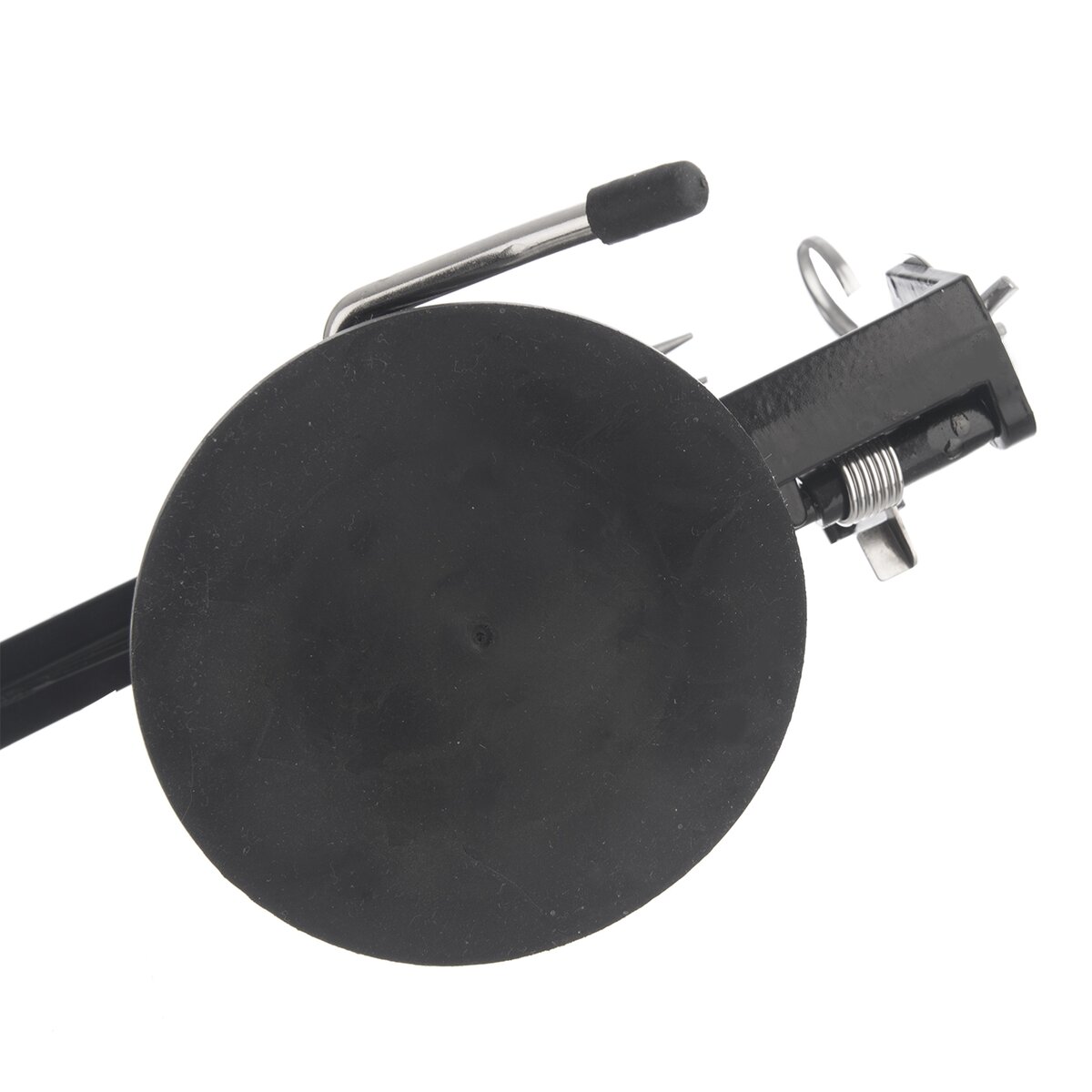 Je to jednoduché. Stačí jej posunutím dolní páčky připevnit přísavkou k čistému, hladkému povrchu, umyté jablko nabodnout na nerezové trny zakončující tyč se závity a začít točit klikou.