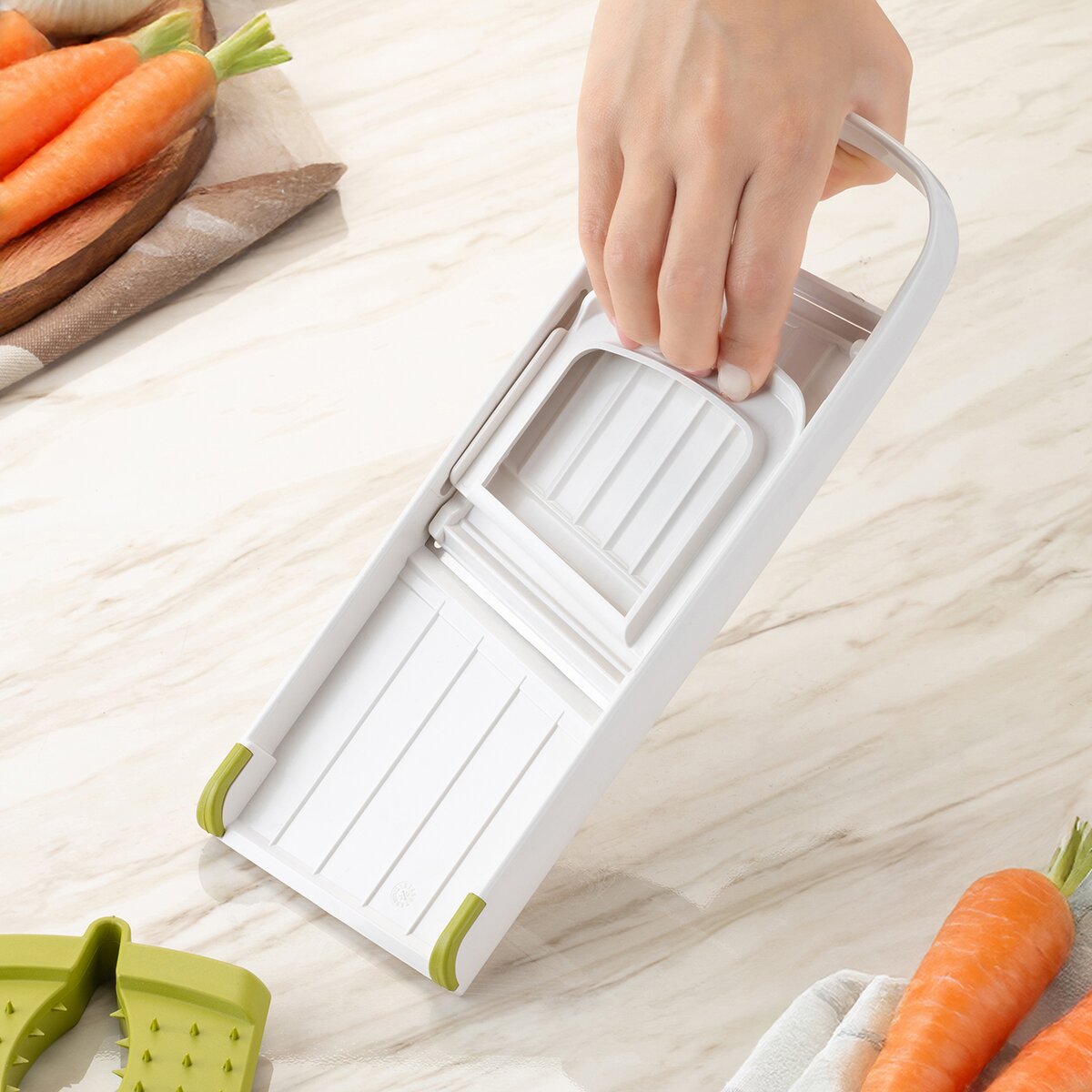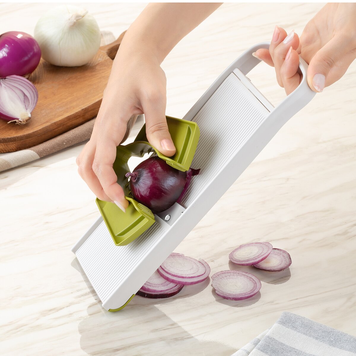 Kráječ je vybaven zeleným držákem proti poranění. Obsahuje speciální hroty, které zajišťují pevné uchycení potravin buď jejich nabodnutím nebo sevřením ve střední části. Umožňuje tudíž bezpečnou manipulaci při krájení brambor, kousku cukety, jablka, cibule, mrkve, okurků i malých surovin, například česneku. Pro větší stabilitu při použití obsahuje kráječ dva protiskluzové rohy z plastu EVA, které zabraňují nežádoucímu posunu kráječe. Kráječ je vyroben z plastu ABS a máostří z nerezové oceli 301, držák z plastu PP.