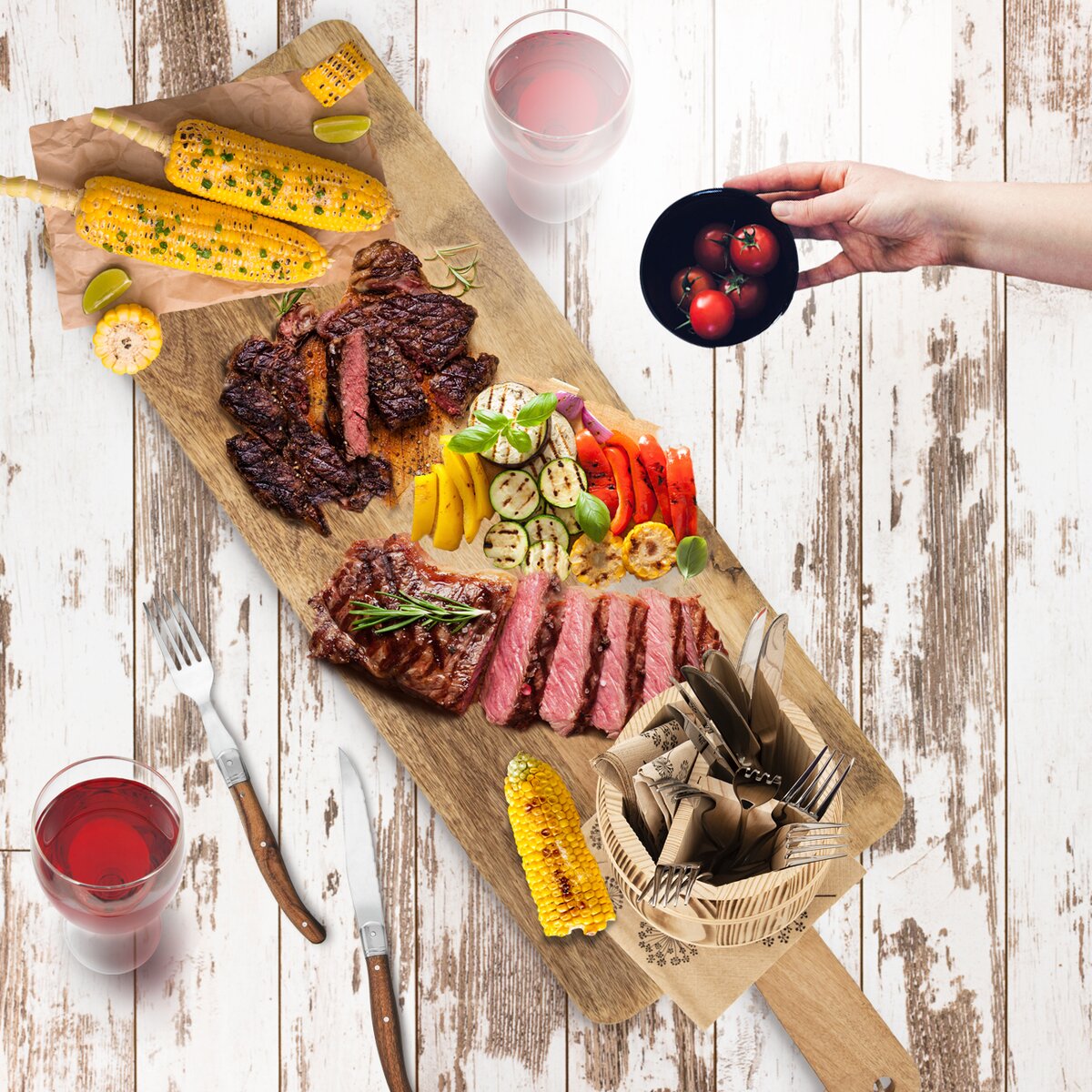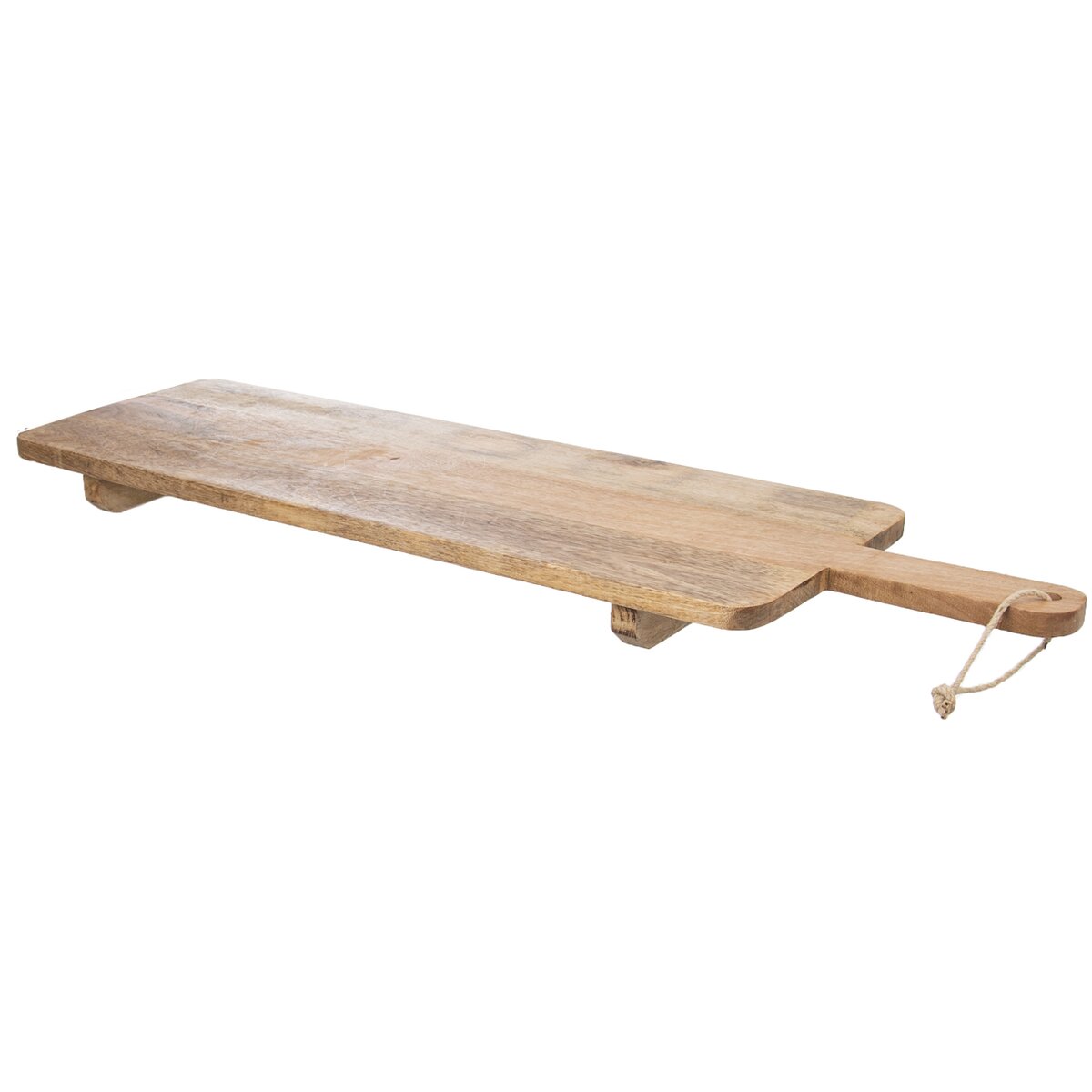 Servírovací a krájecí prkénko z mangového dřeva ve velikosti XXL, rozměru 100x29x6,5 cm, bude skvělým doplňkem prostřeného stolu doma, na terase nebo při grilování. Vše na něm naservírujete hostům doprostřed stolu. A pokud nechcete vyvařovat nebo řešit catering, stačí objednat různé druhy pizzy a servírovat je na tomto obřím prkénku.