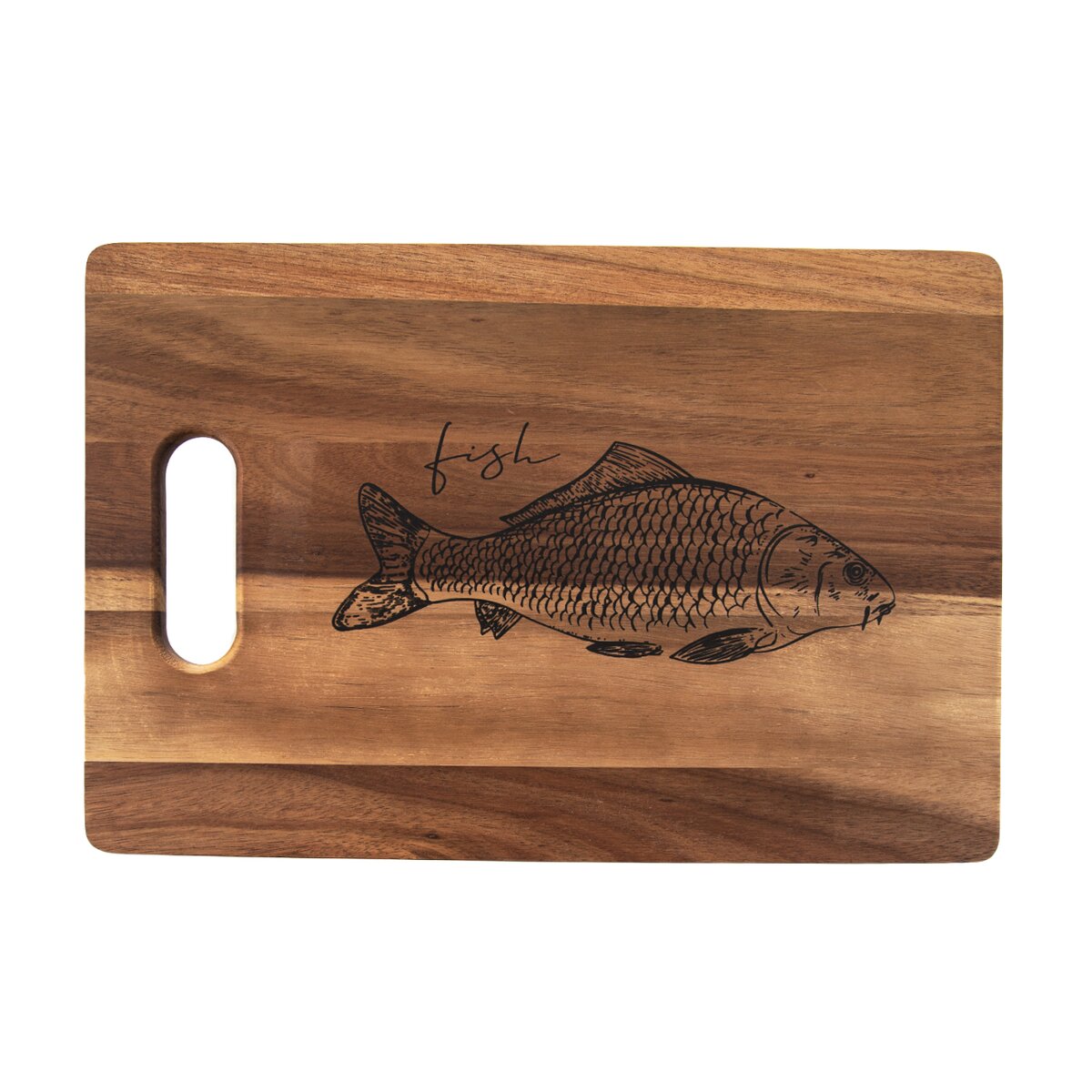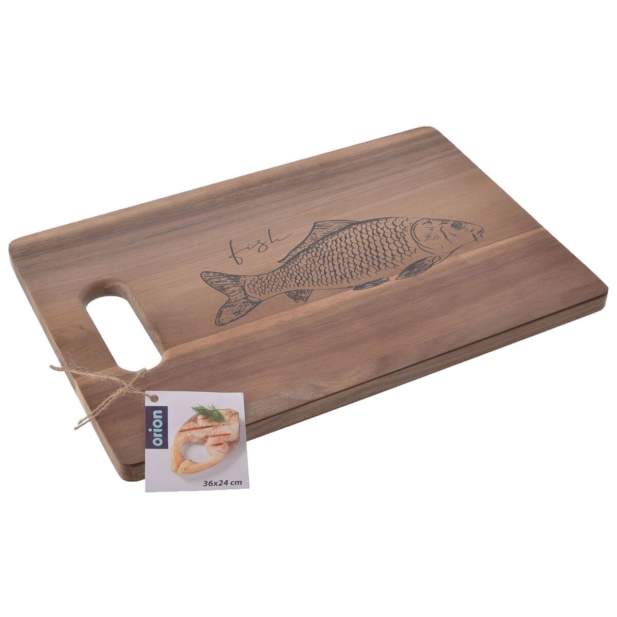 Kód produktu 126851Dřevěné prkénko z akácie o rozměrech 36×24 cm je doplněno motivem ryby. Hodí se na krájení různých druhů ryb a mořských plodů, případně k jejich servírování z grilu.