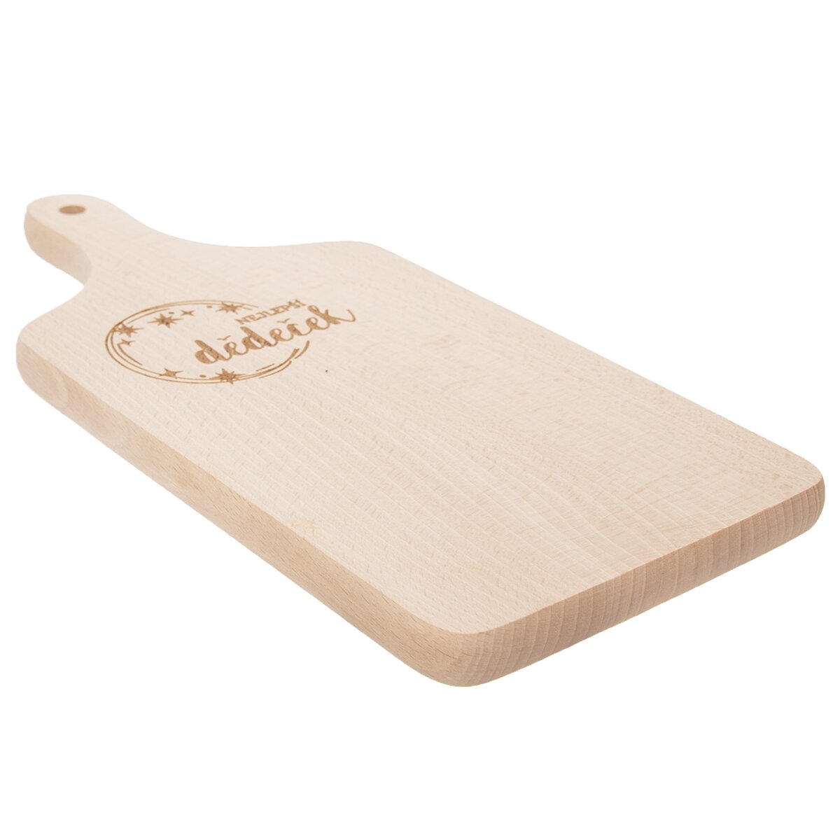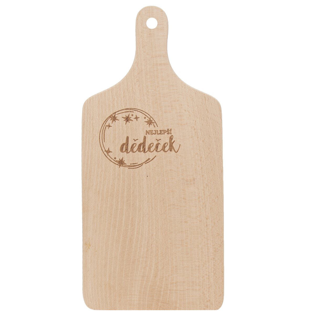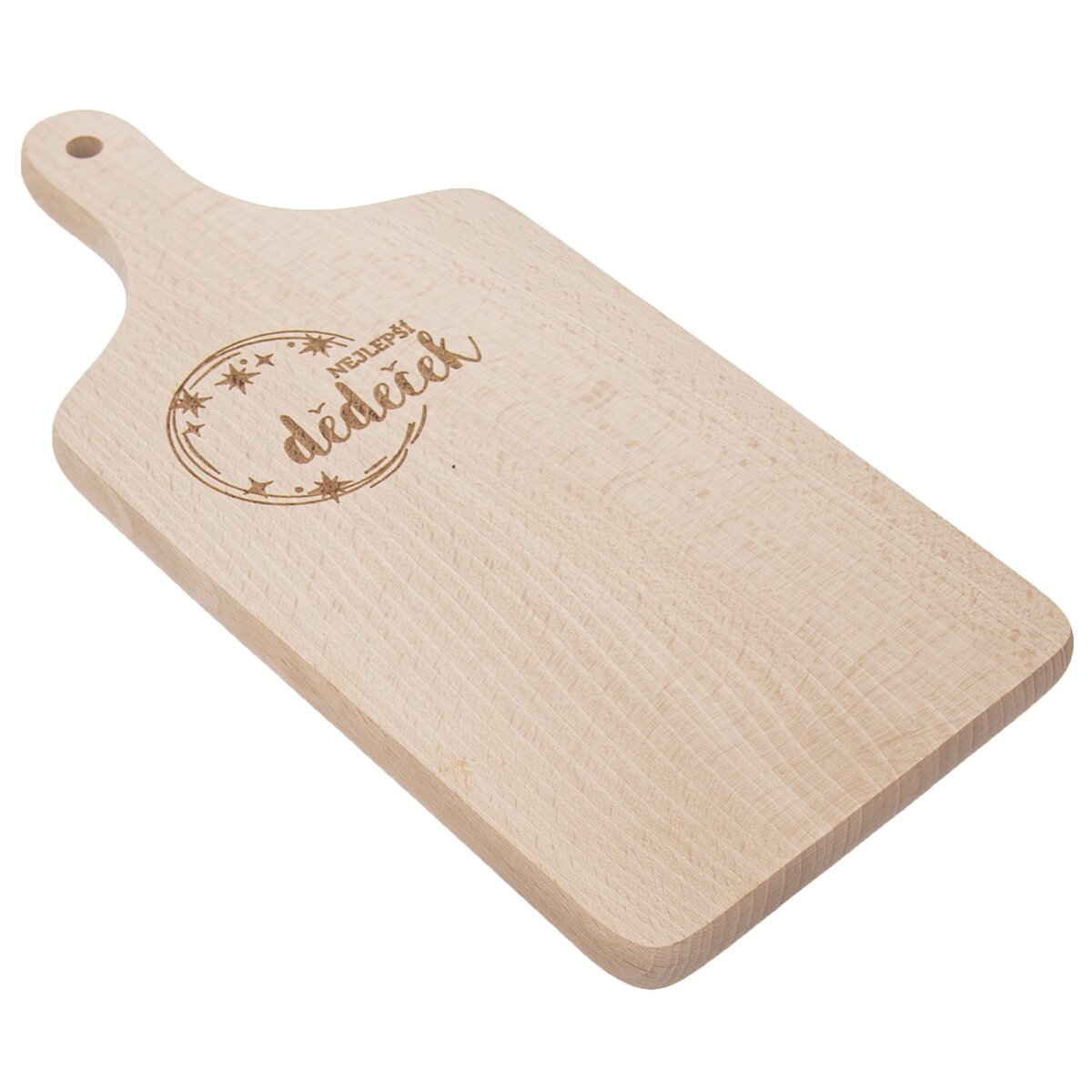 Kód produktu 126829Dřevěné krájecí prkénko o rozměru 30×14 cm s praktickou rukojetí a vypalovaným dekorem NEJLEPŠÍ DĚDEČEK.