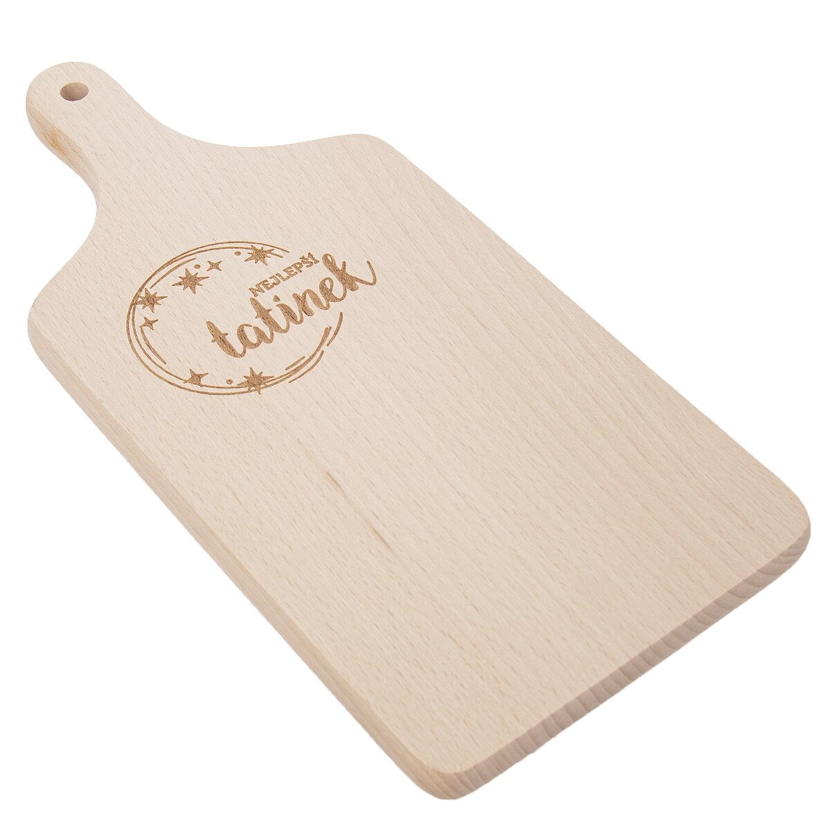 Kód produktu 126830Dřevěné krájecí prkénko o rozměru 30×14 cm s praktickou rukojetí a vypalovaným dekorem NEJLEPŠÍ TATÍNEK.