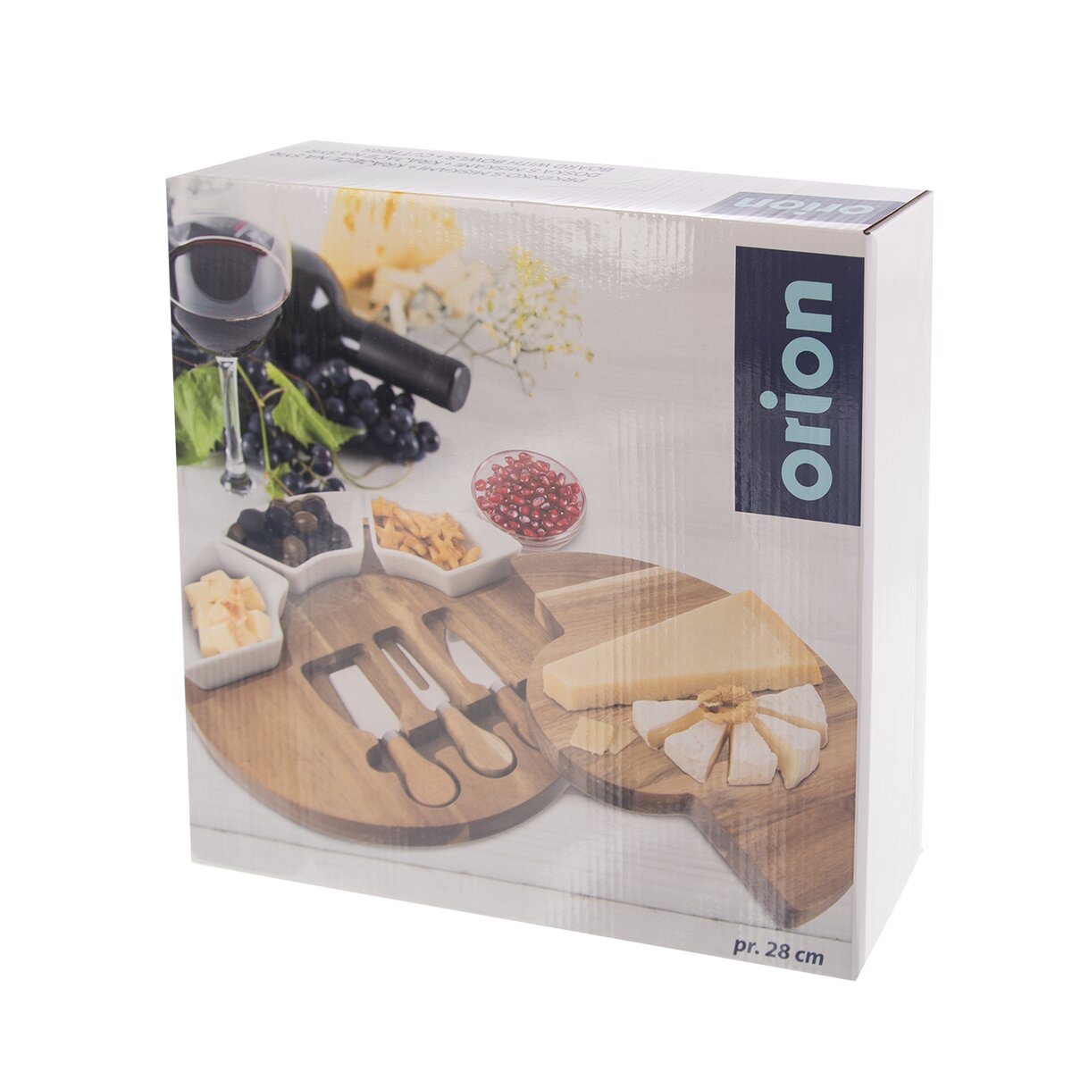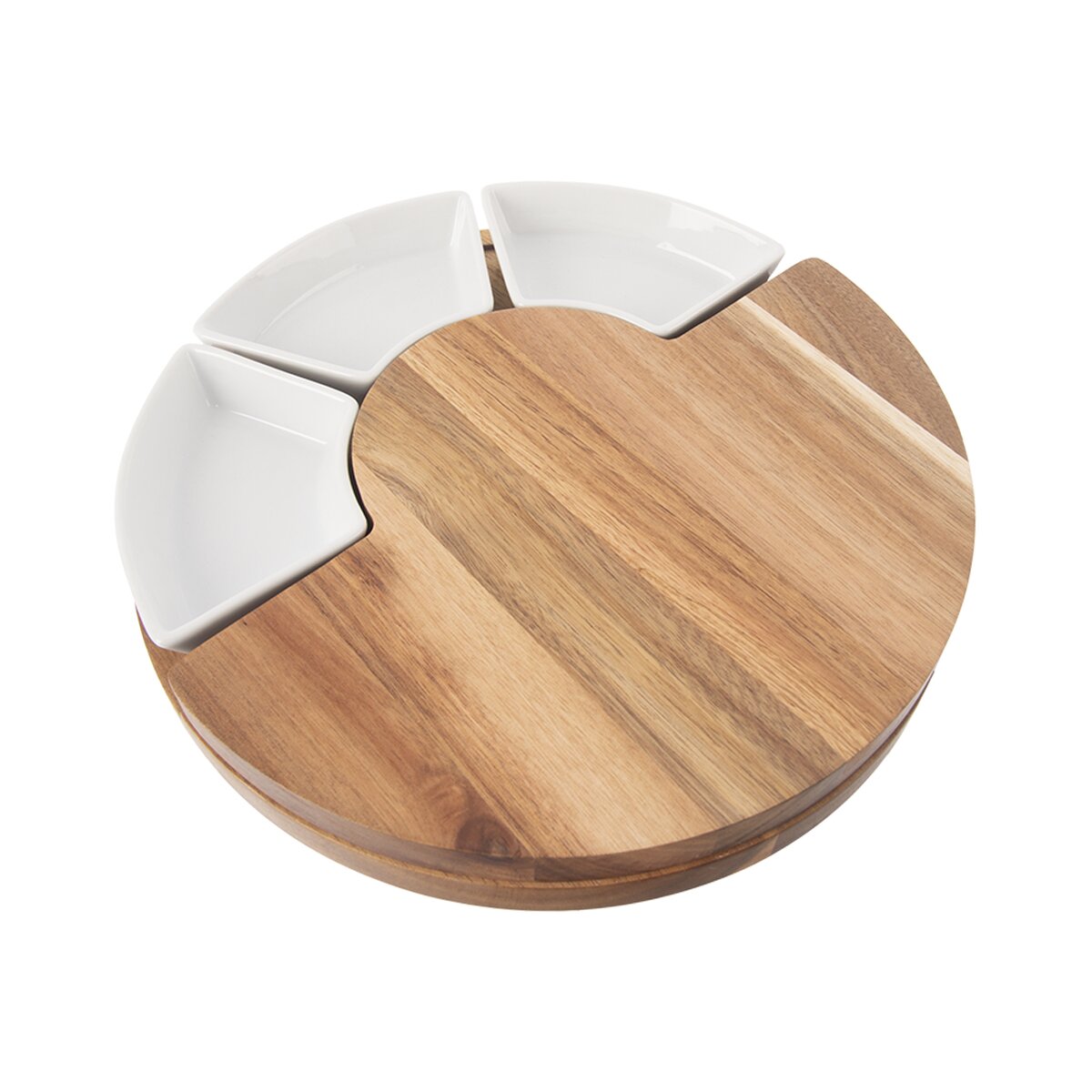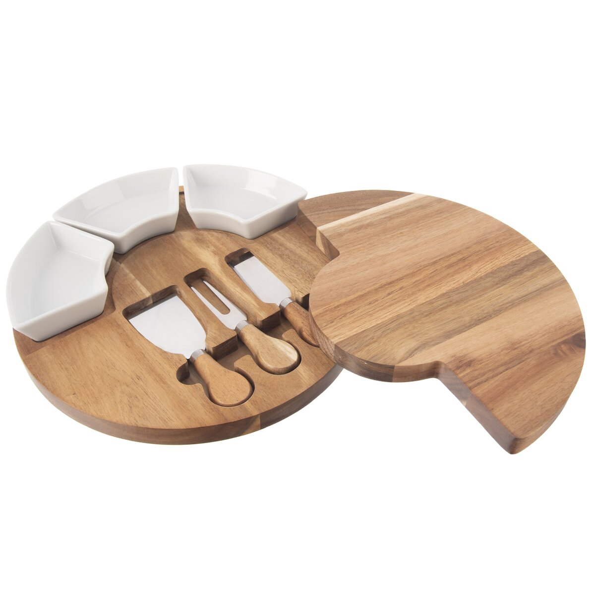 Kód produktu 126843Sada krájecího akáciového prkénka o průměru 28 cm ukrývá 3 kráječe na sýr o délce 13 cm a je doplněna 3 keramickými miskami na oříšky, olivy, dipy nebo různé drobné krekry.