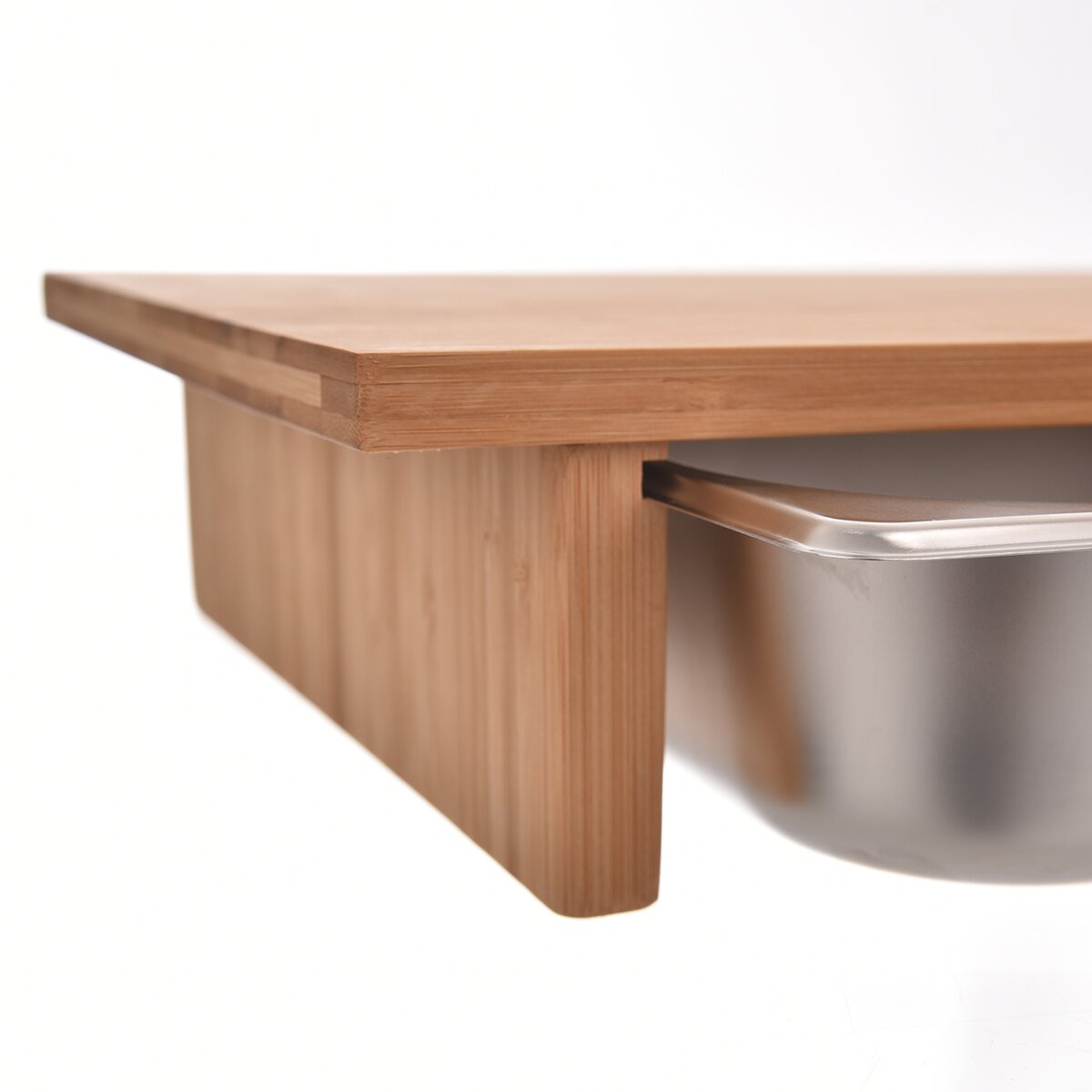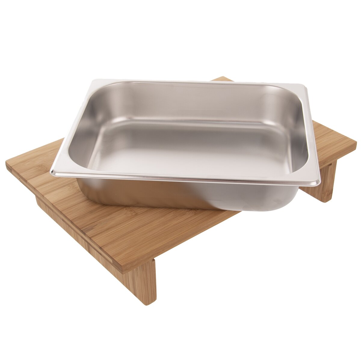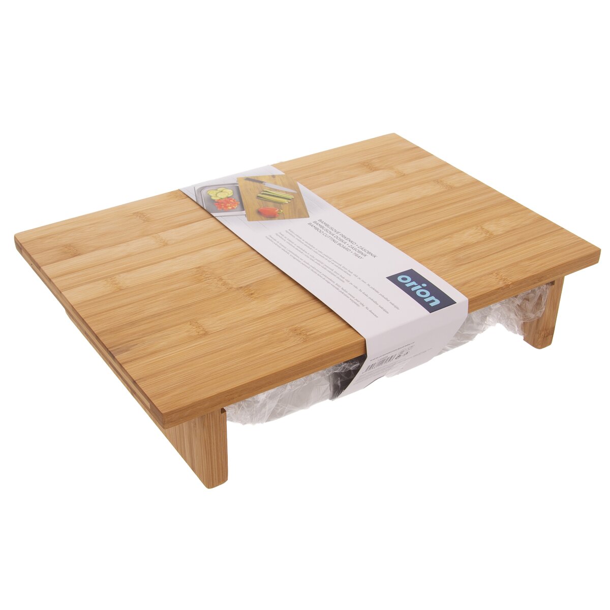 Kód produktu 126808Bambusové krájecí prkénko o rozměru 42×29×8,5 cm s nerezovým zásobníkem o rozměru 32,5×26,5×6 cm.
