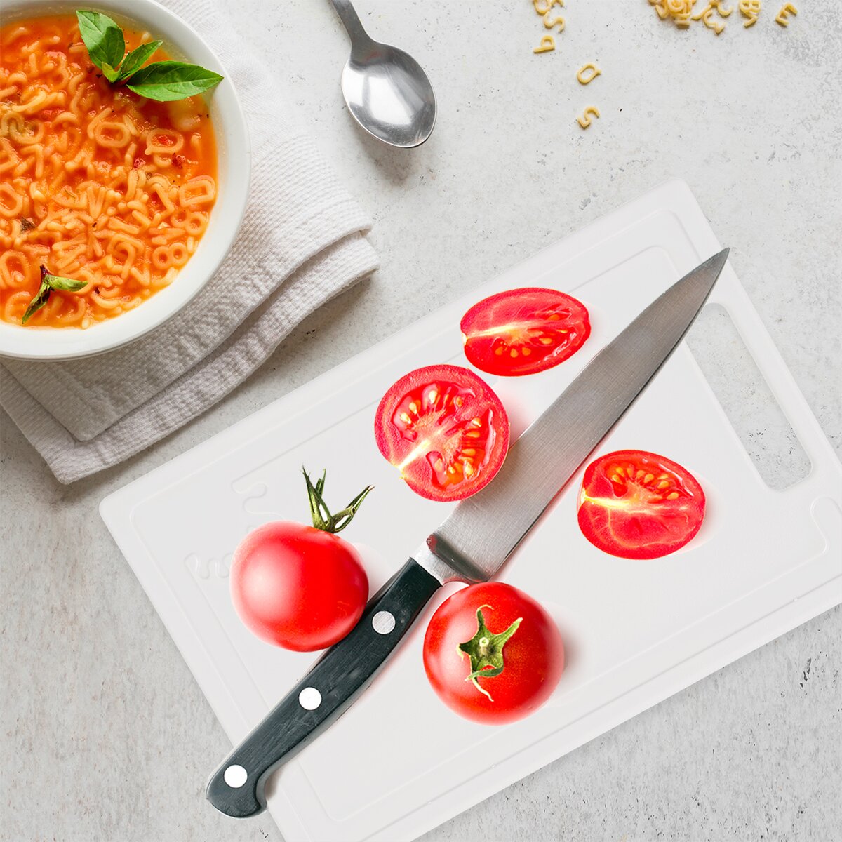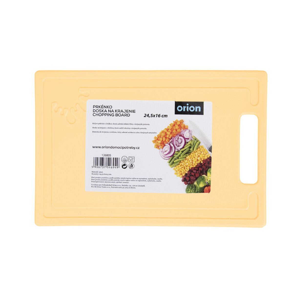 Kód produktu 126805Barevné plastové krájecí prkénko rozměru 24,5x16 cm s praktickým otvorem - rukojetí. Je určené pro krájené nejrůznějších potravin a opatřené šikovnou drážkou po obvodu.