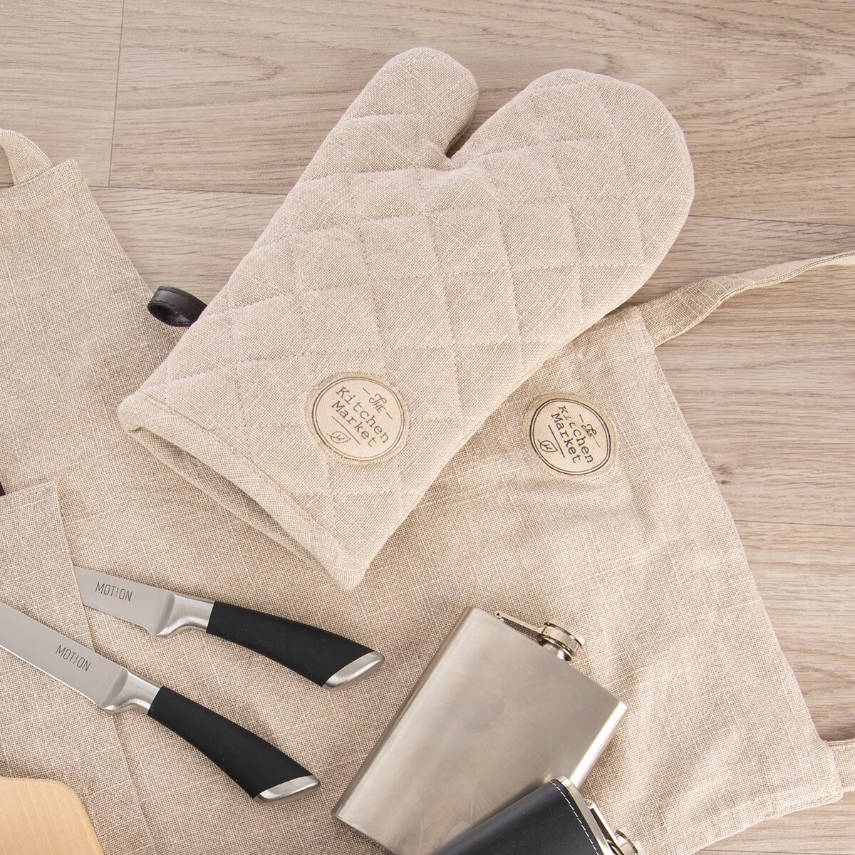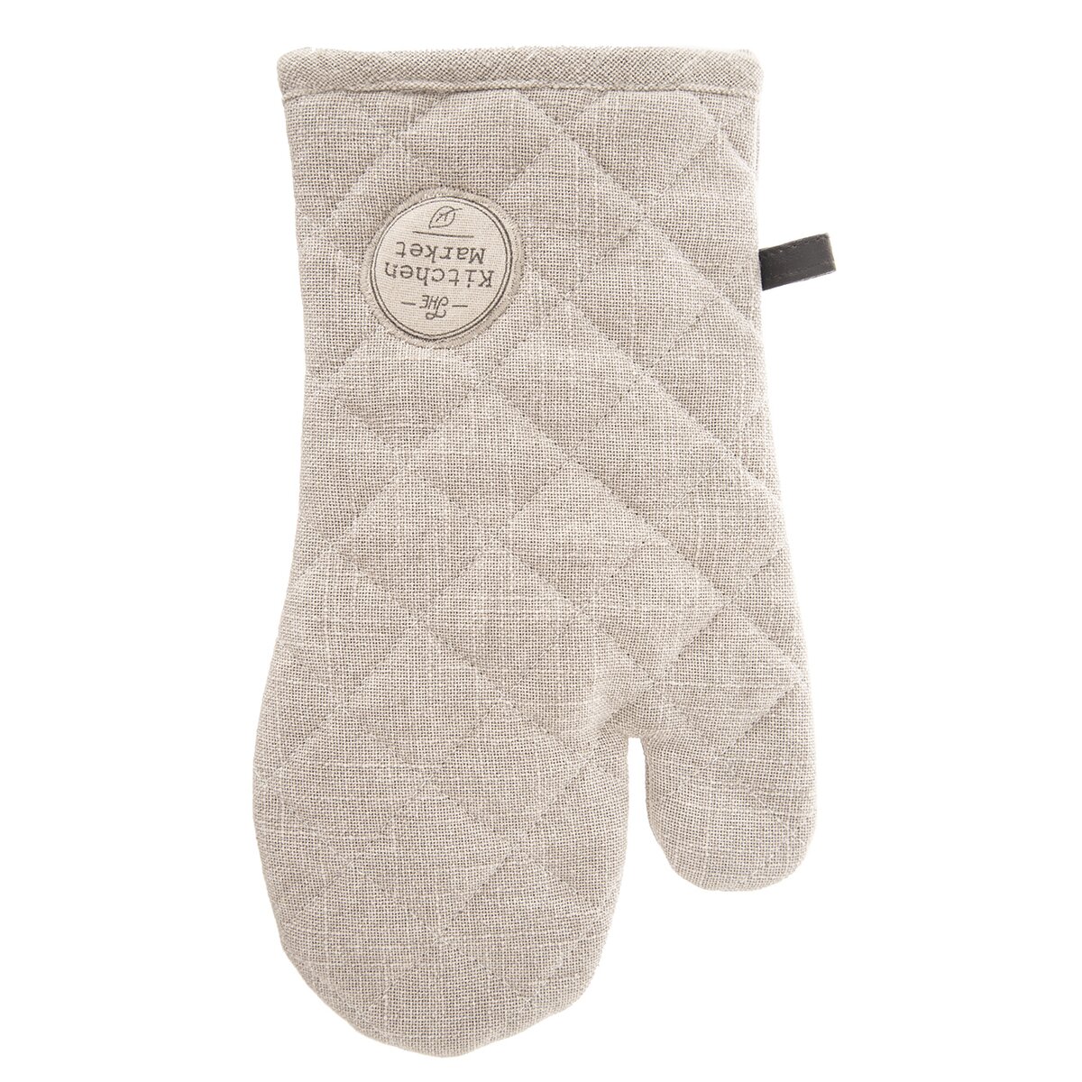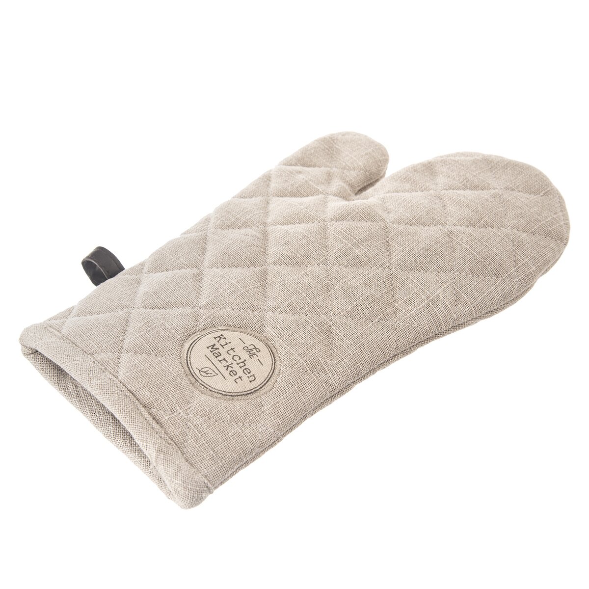 Kód produktu 153906Bavlněná kuchyňská rukavice v béžové barvě, s poutkem pro zavěšení a v délce 31 cm. Zajímavý všitý detail s nápisem The Kitchen Market.