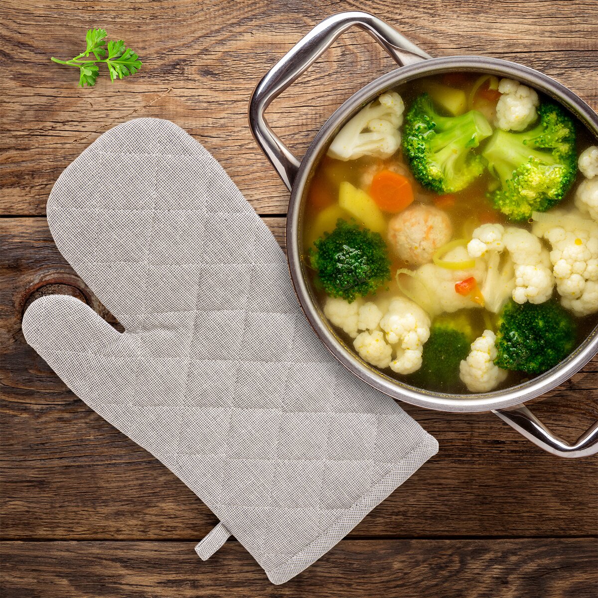 Více informacíI kuchyňská chňapka může být stylová. To potvrzuje tato bavlněná kuchyňská rukavice, která je díky neutrální šedobéžové barvě elegantním a funkčním doplňkem do kuchyně.